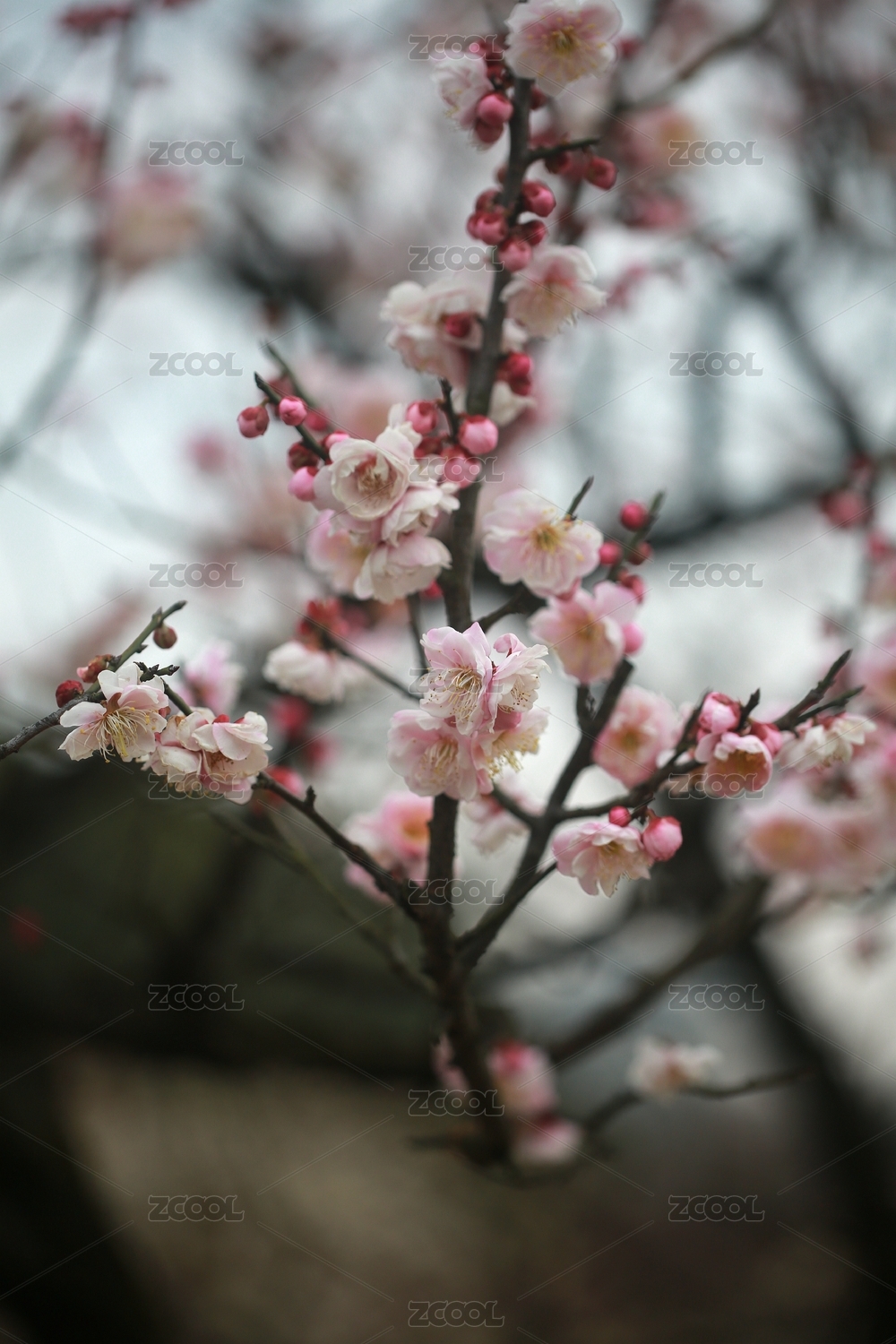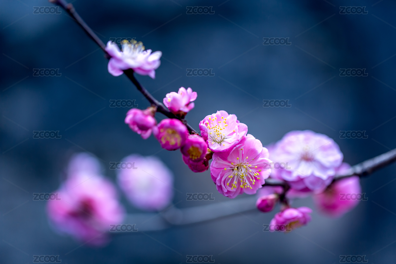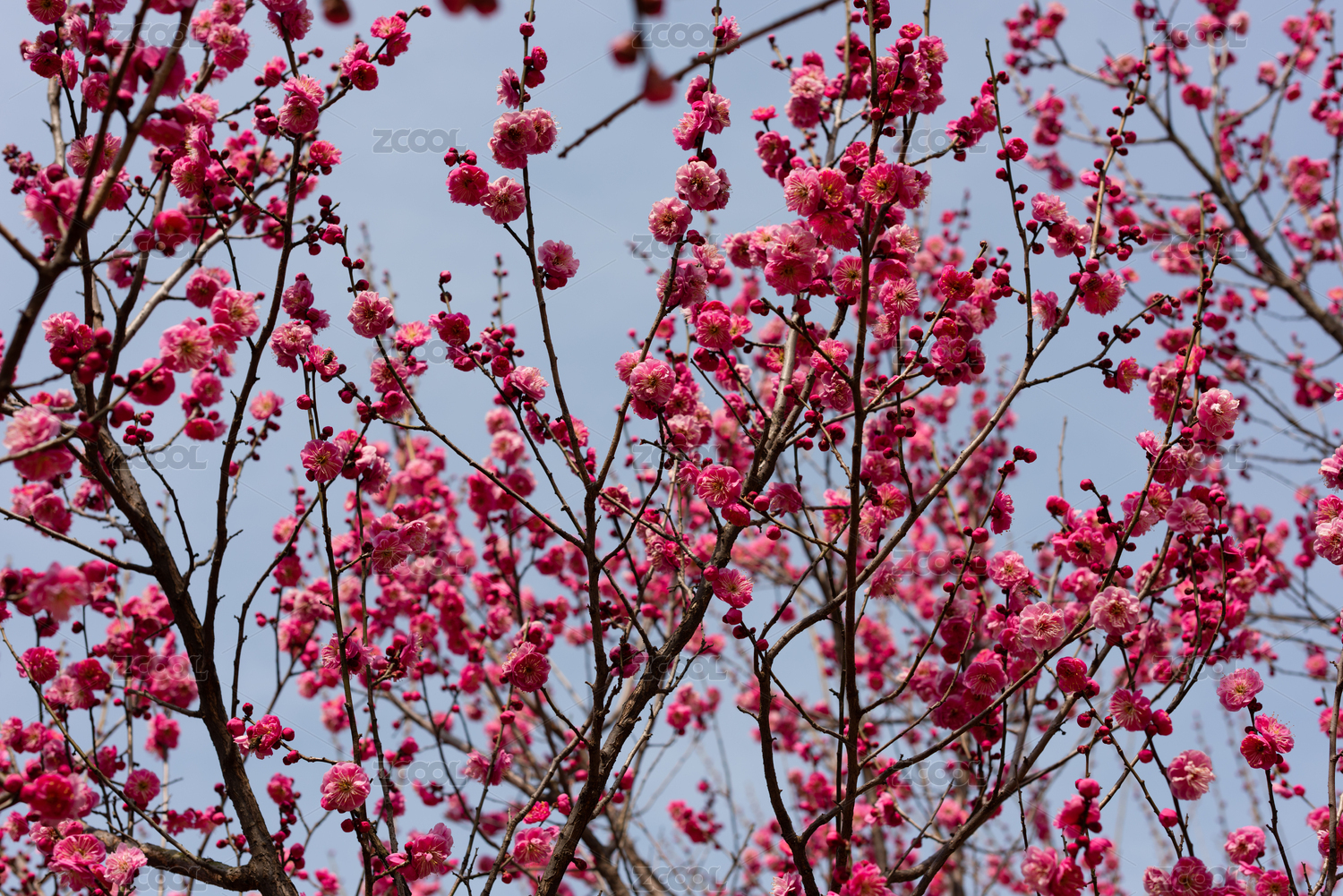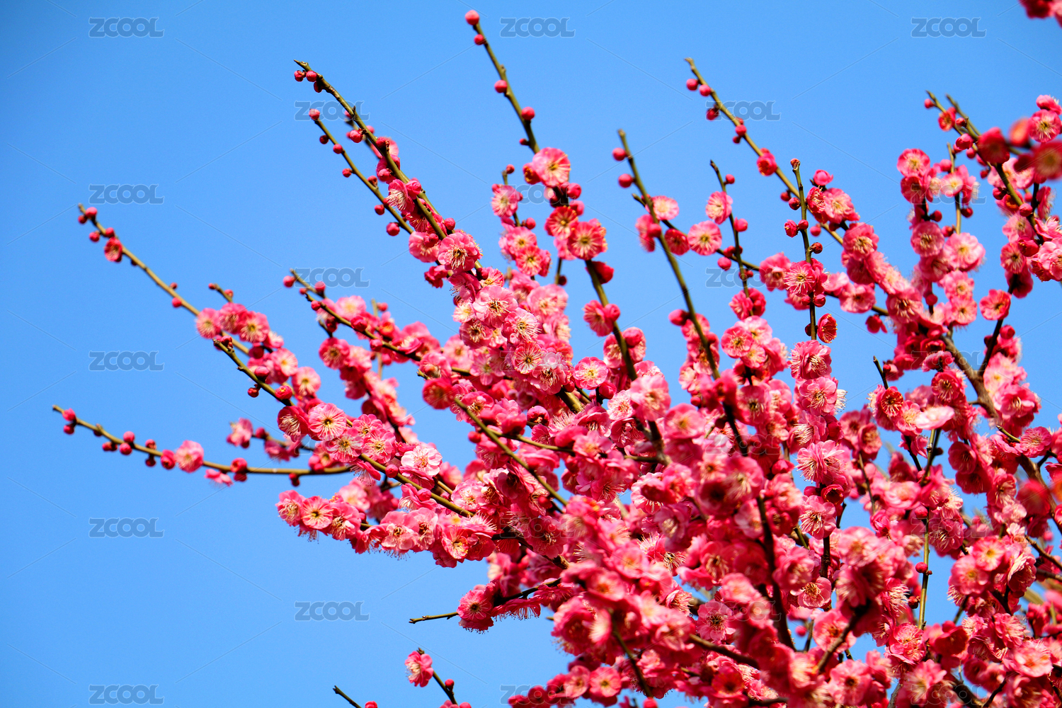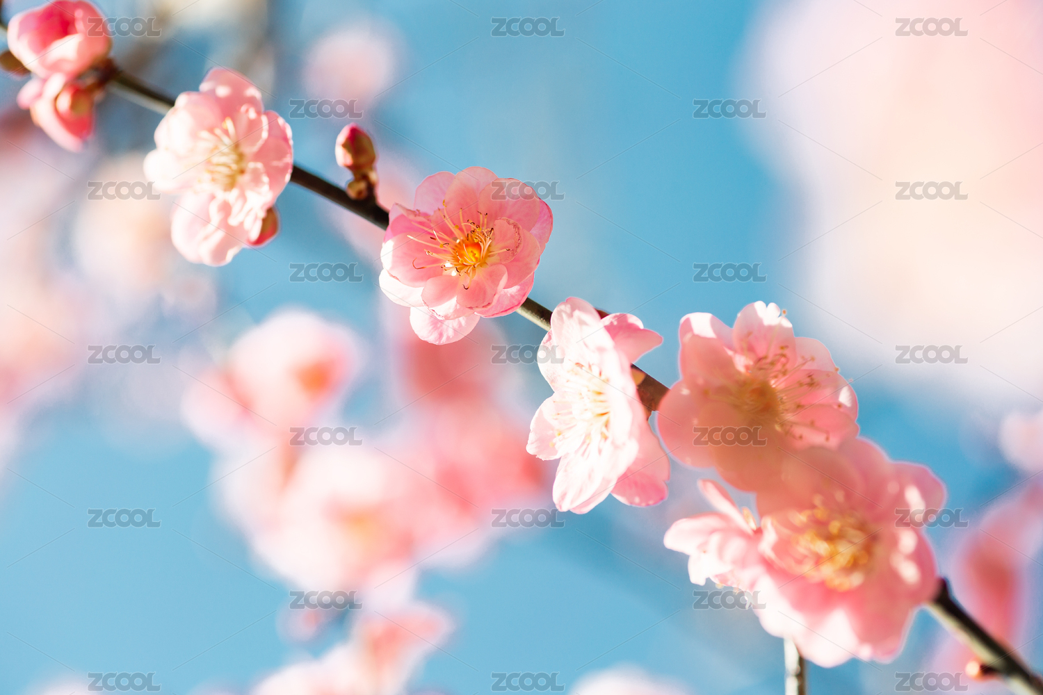 藍(lán)天下左構(gòu)圖的宮粉梅花枝