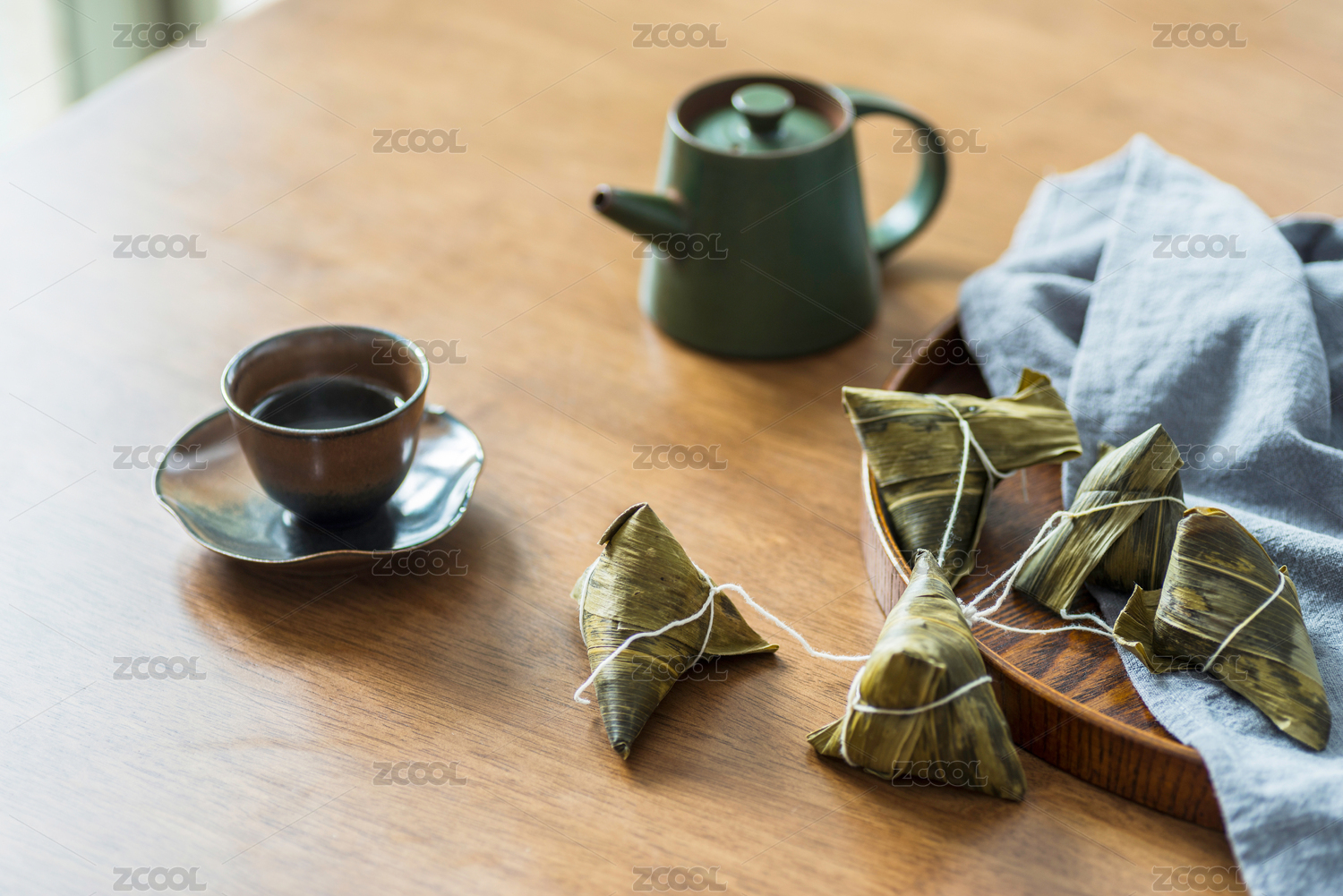 落地窗前放著茶水的木桌上被手提起的一掛粽子