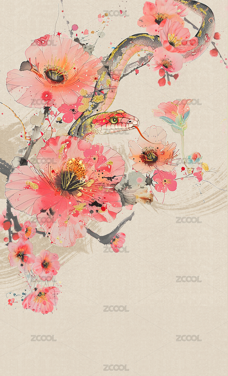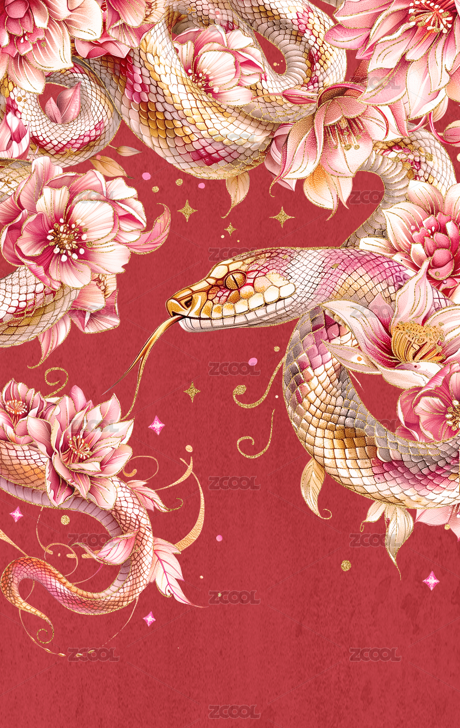 新年紅包封面蛇年乙巳花與蛇蛇年大吉