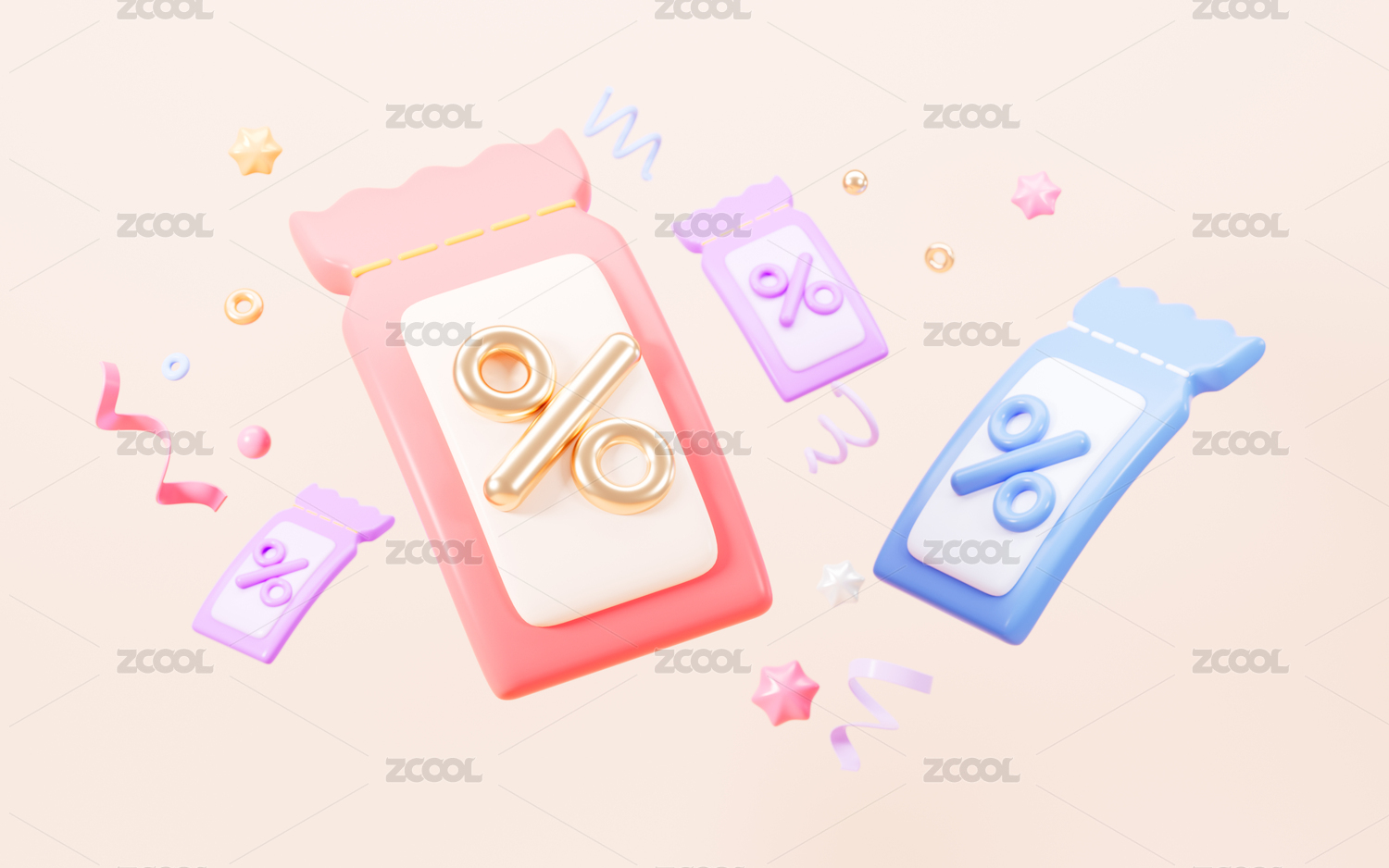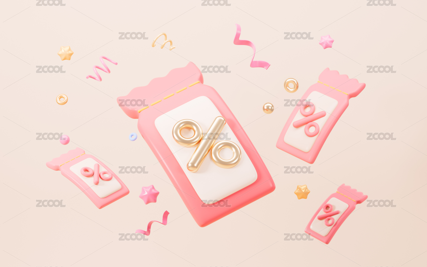 卡通優(yōu)惠券代金券和禮物購物促銷3D渲染