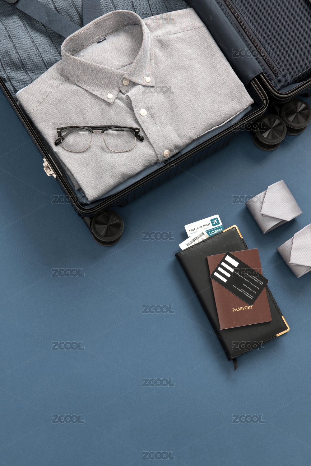 打開的行李箱有襯衫領帶眼鏡等出行用品