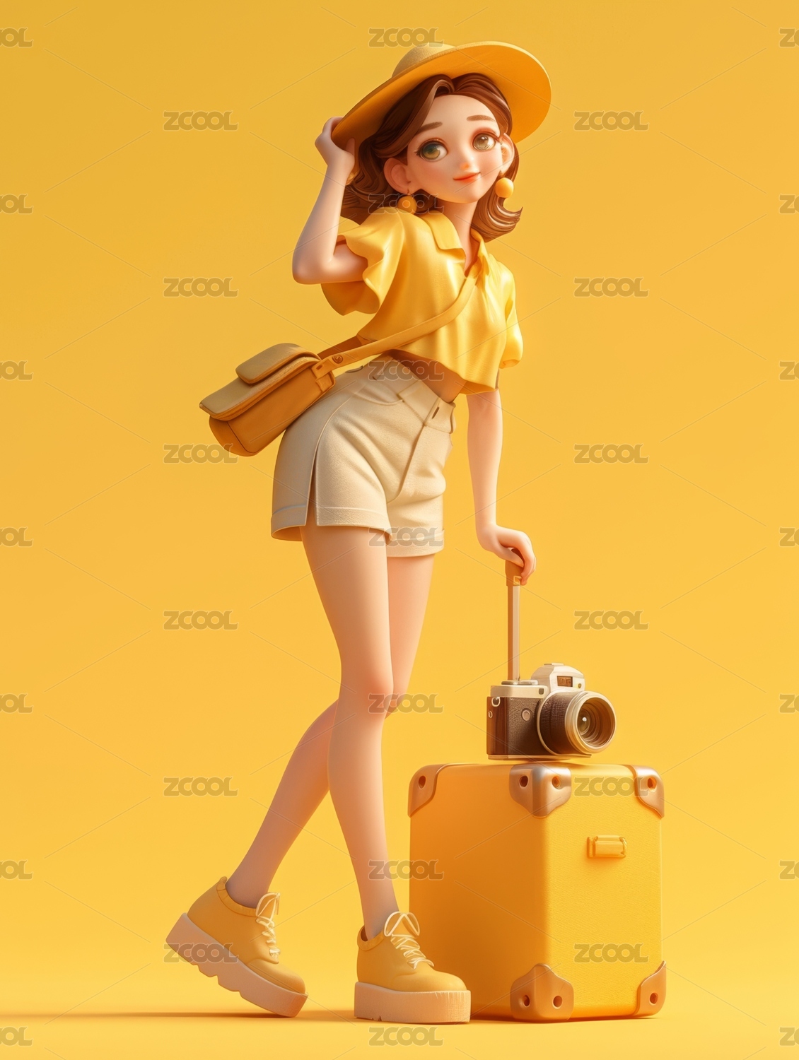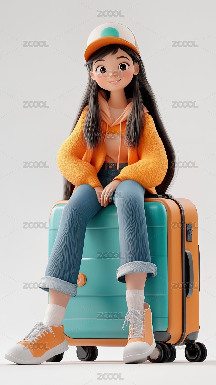 拉著行李箱拿著相機去旅游3D卡通女孩插畫