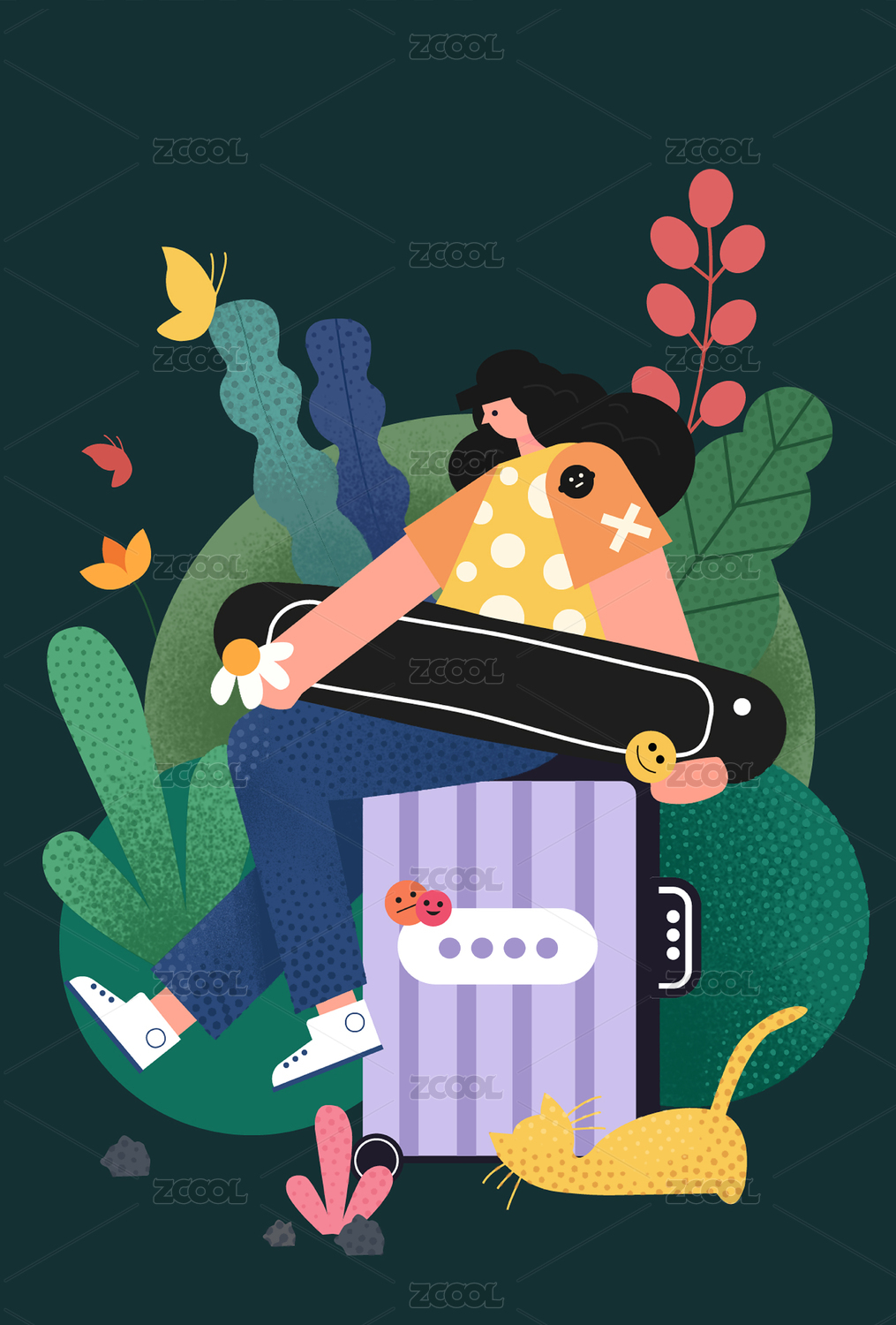 女孩抱著滑板坐在行李箱上去旅行