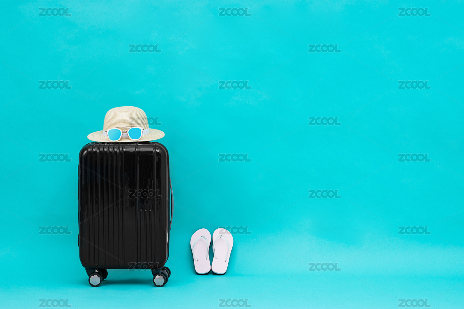 黑色的行李箱上面擺放著青色太陽鏡,放在淺灰色背景中間前