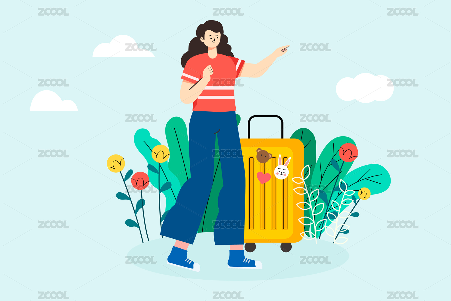 拉著行李箱去旅行的女孩矢量插畫