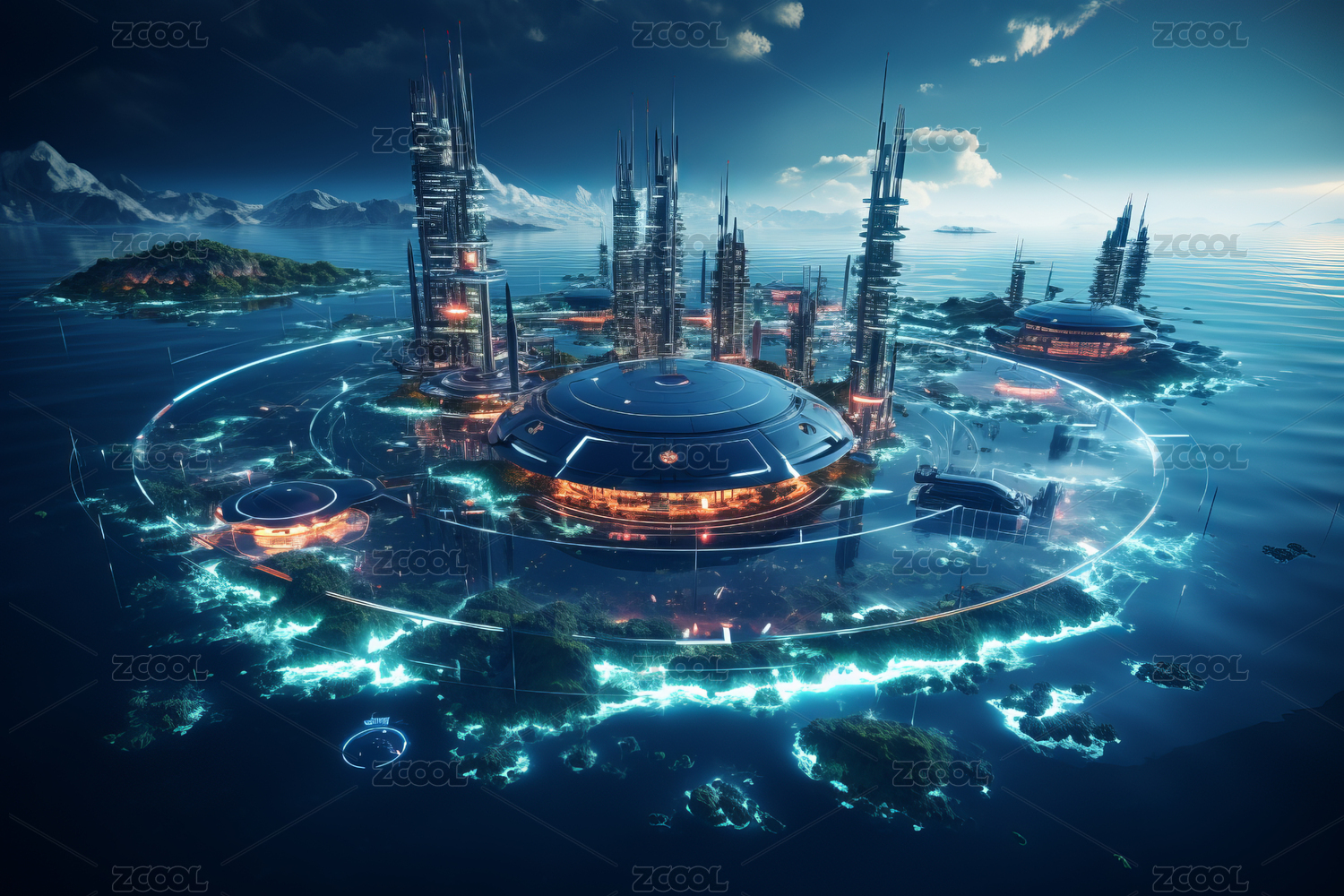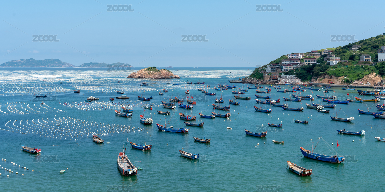 中國(guó)舟山枸杞島藍(lán)色海洋上有排列有序的漁船