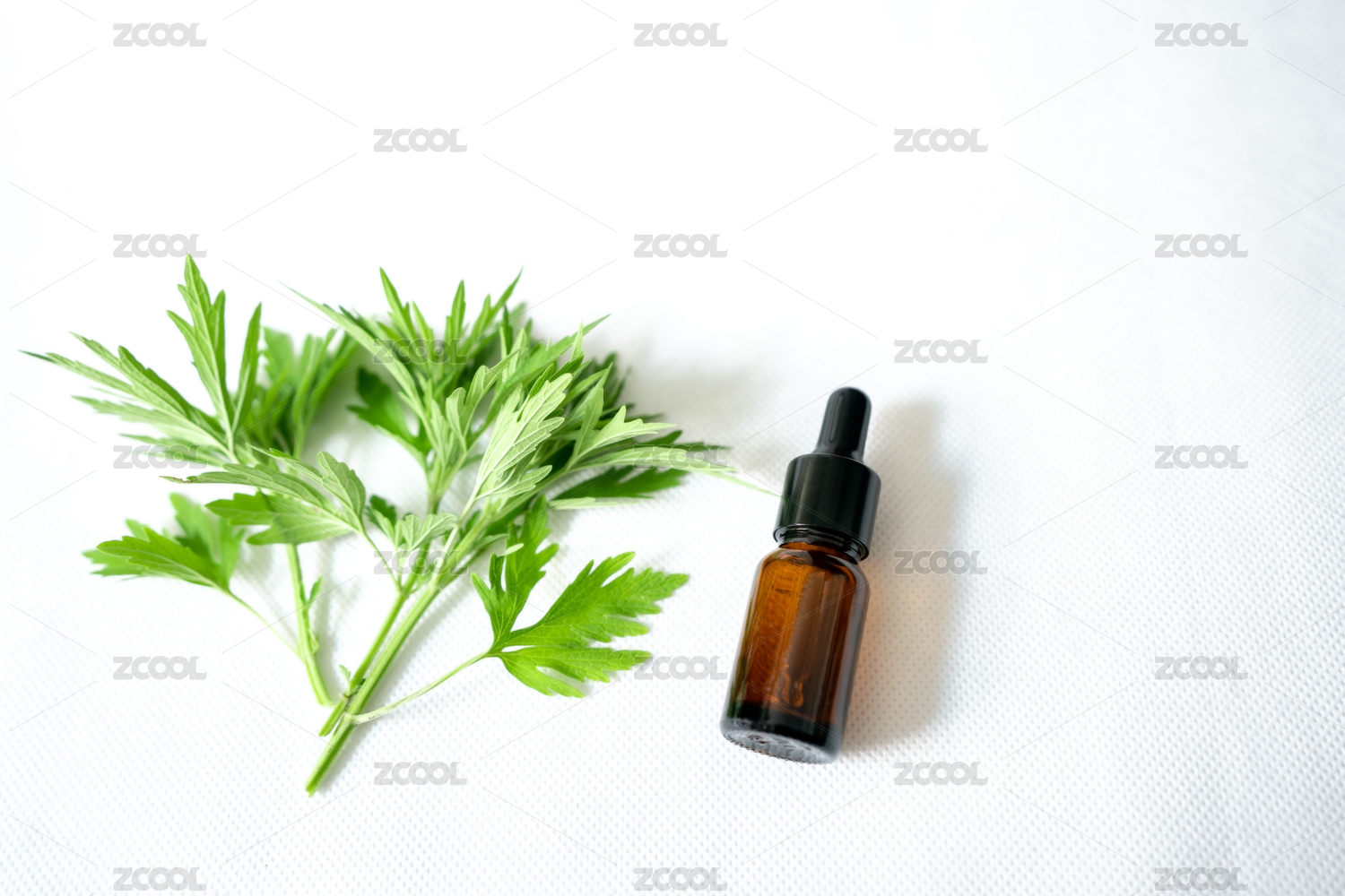 白色背景艾草和小玻璃瓶