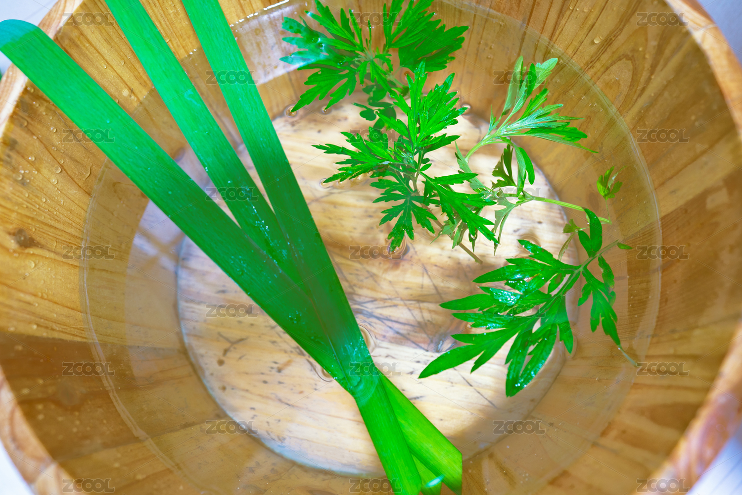 木制腳盆水里泡著艾草和菖蒲