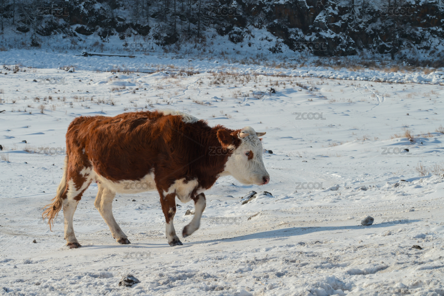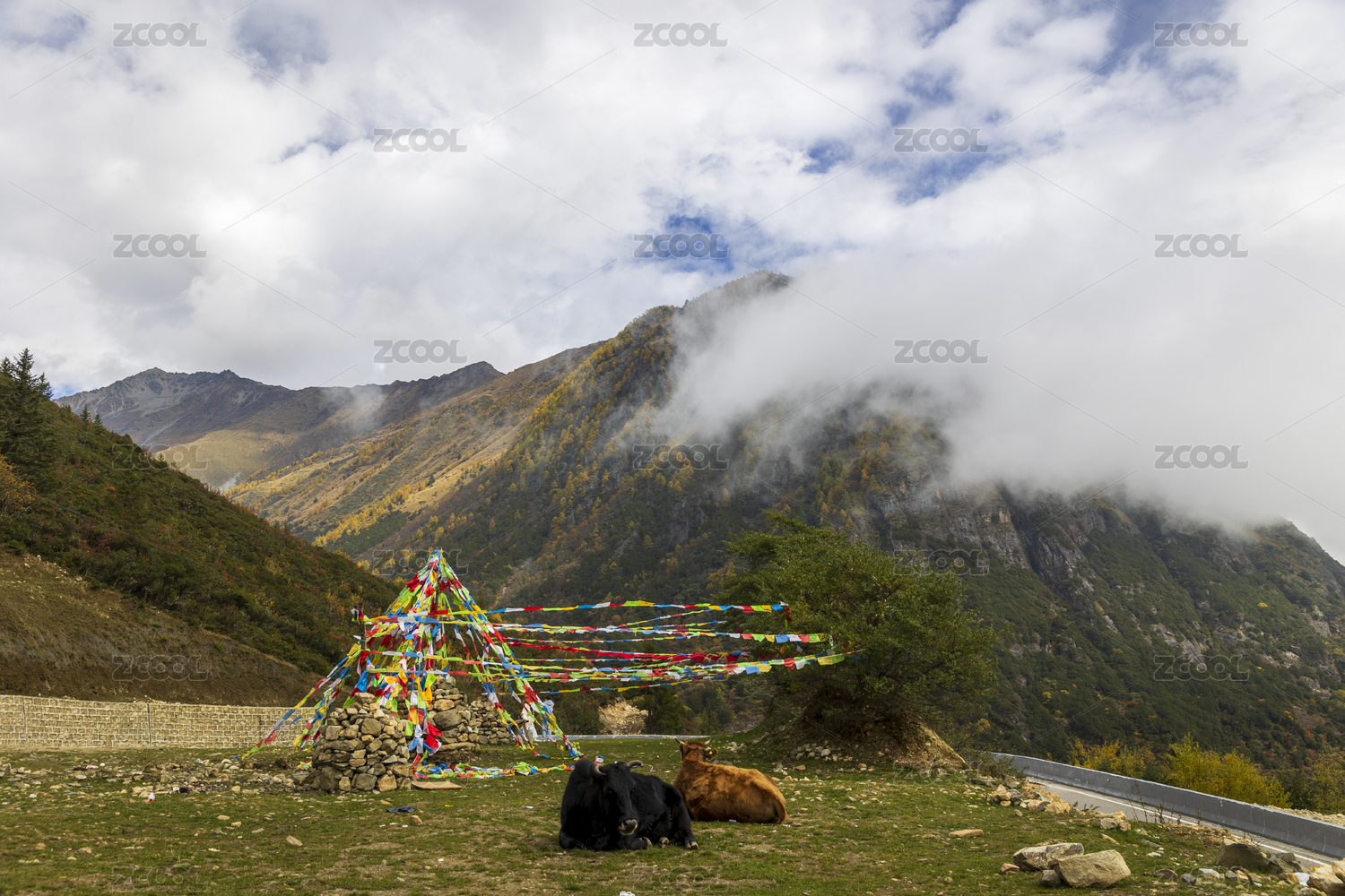 秋天川西高原云霧繚繞的山峰和悠閑的牛兒