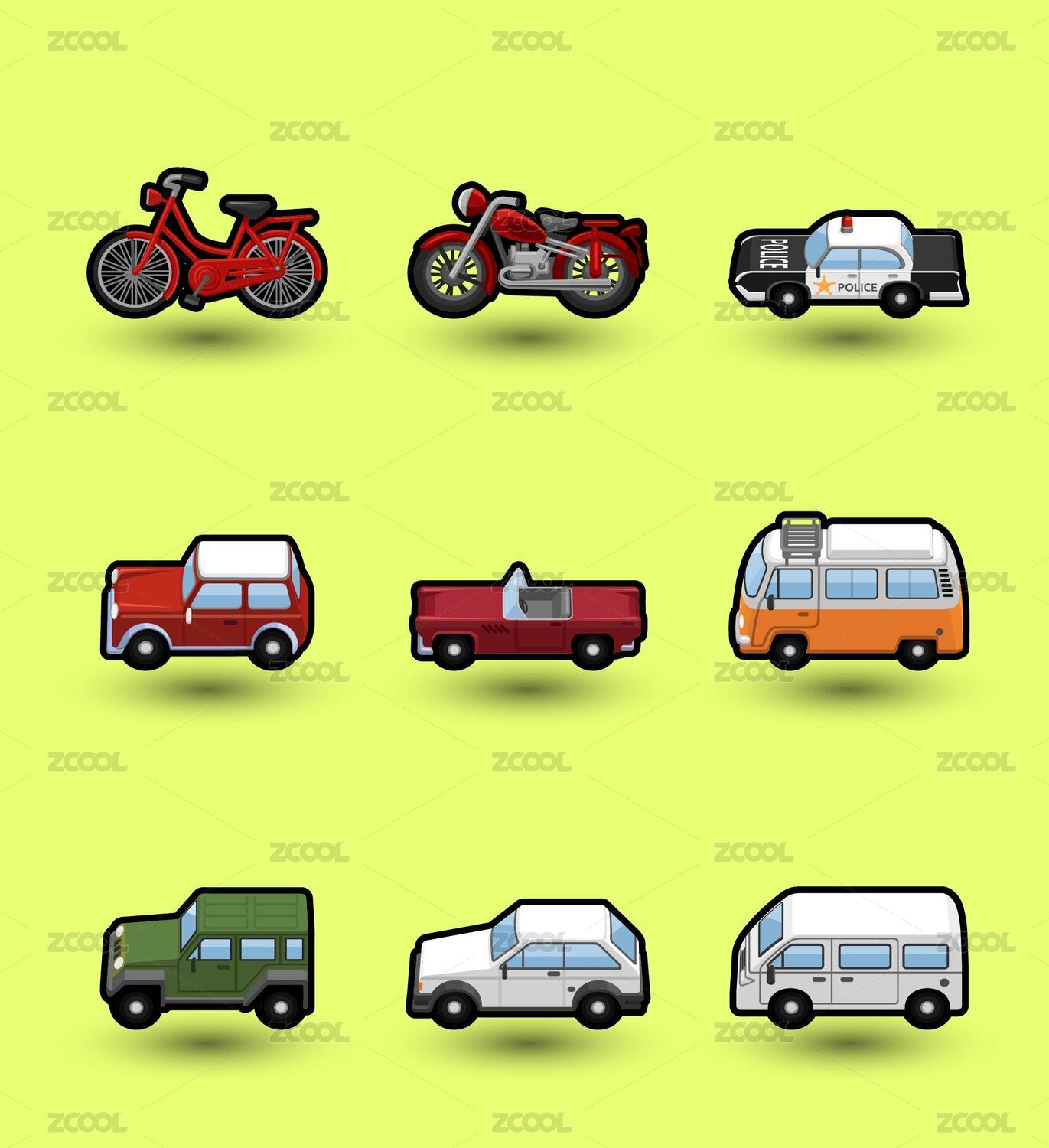 矢量扁平汽車自行車摩托車