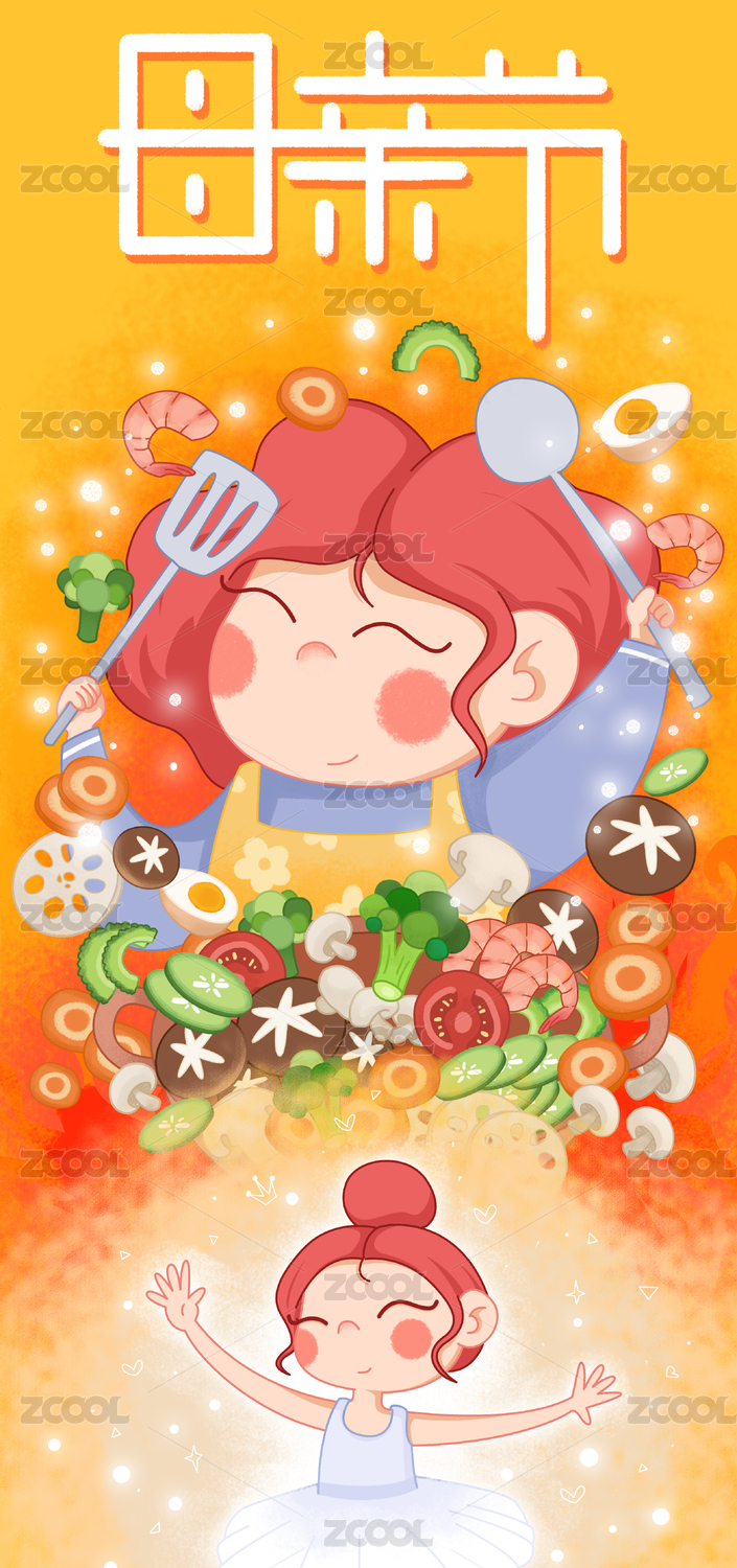 母親節(jié)母親手拿飯鏟飯勺蔬菜四周環(huán)繞做飯
