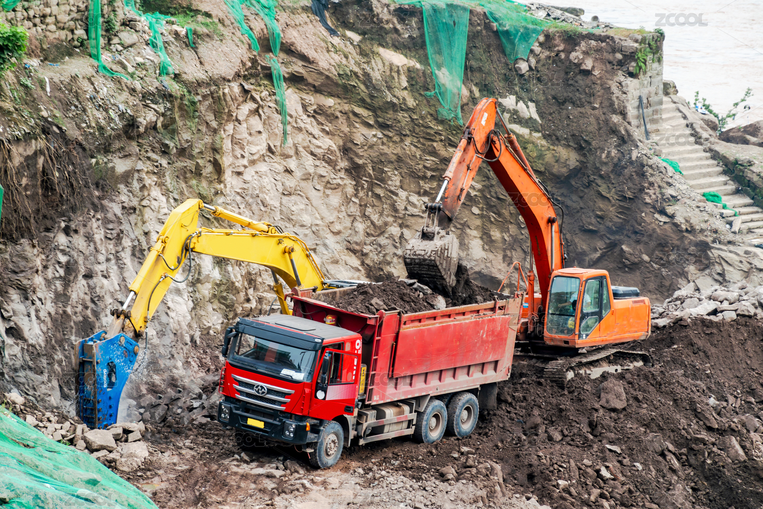 工地上正在作業(yè)的挖掘機(jī)與工程車