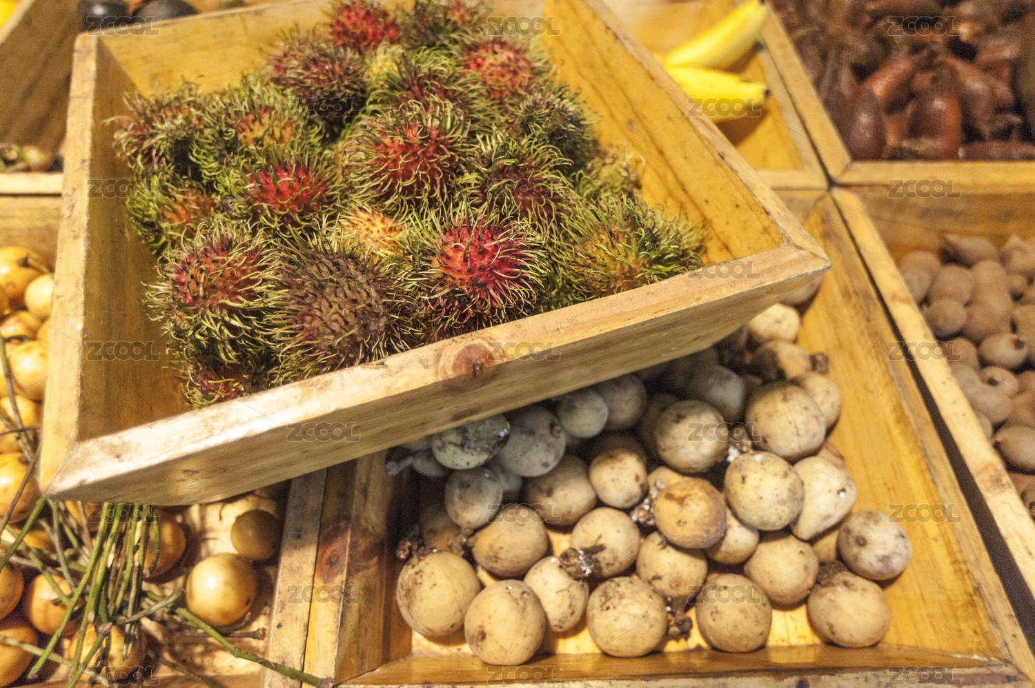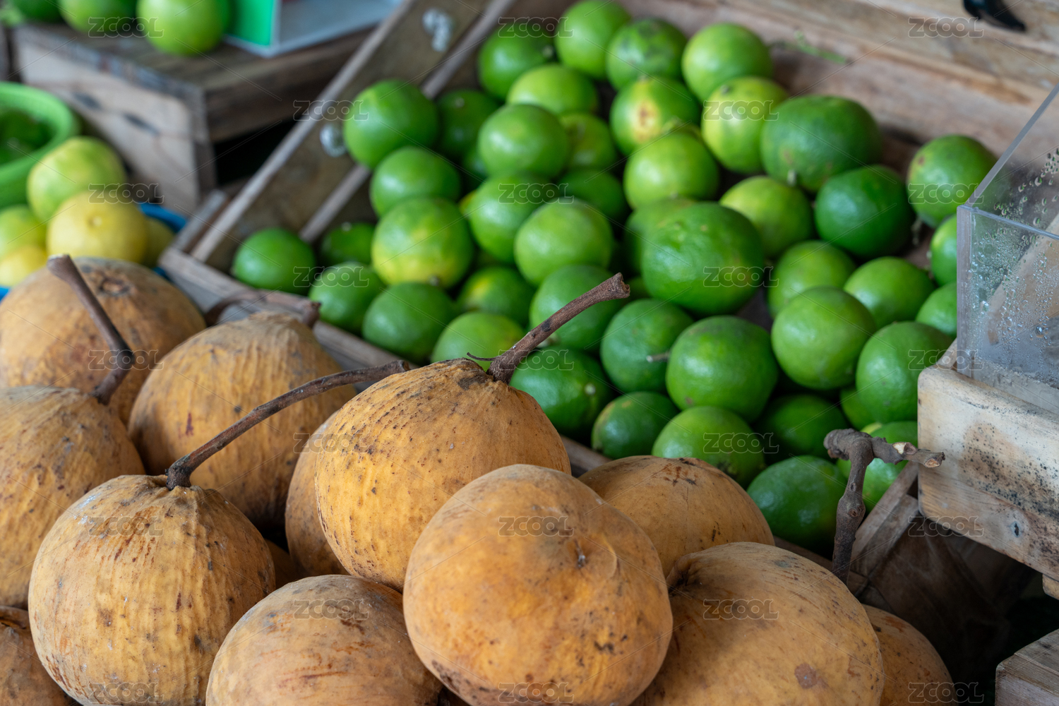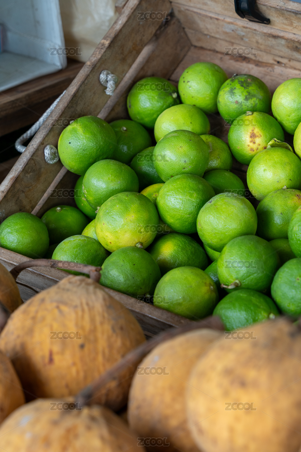 木箱中堆滿新鮮綠色的青檸和熱帶水果