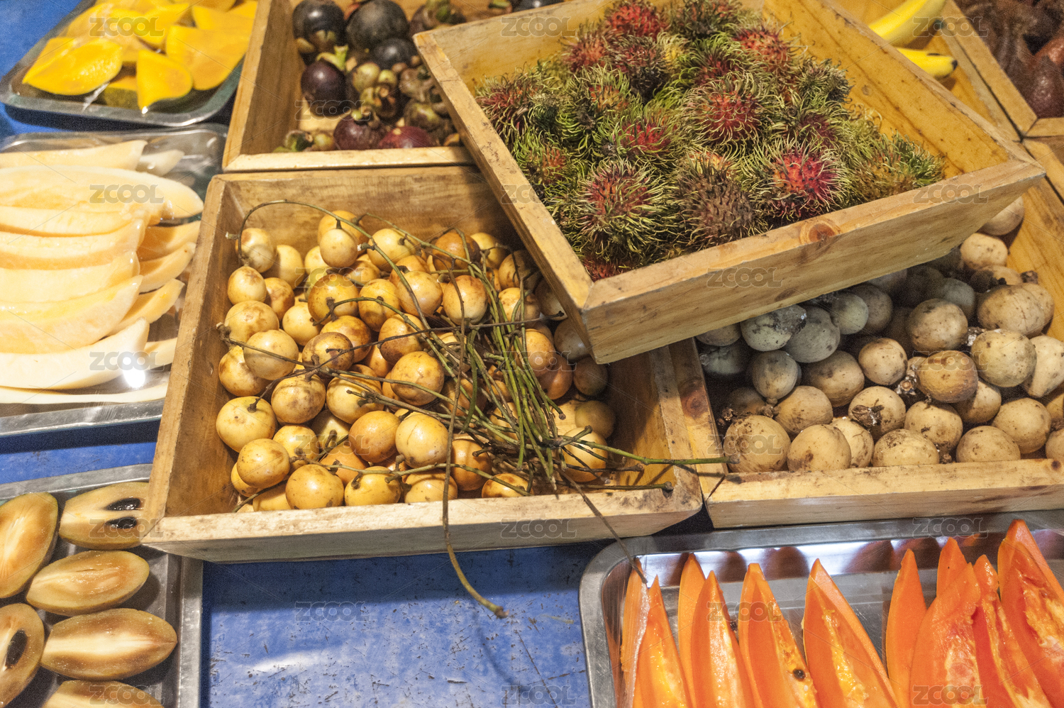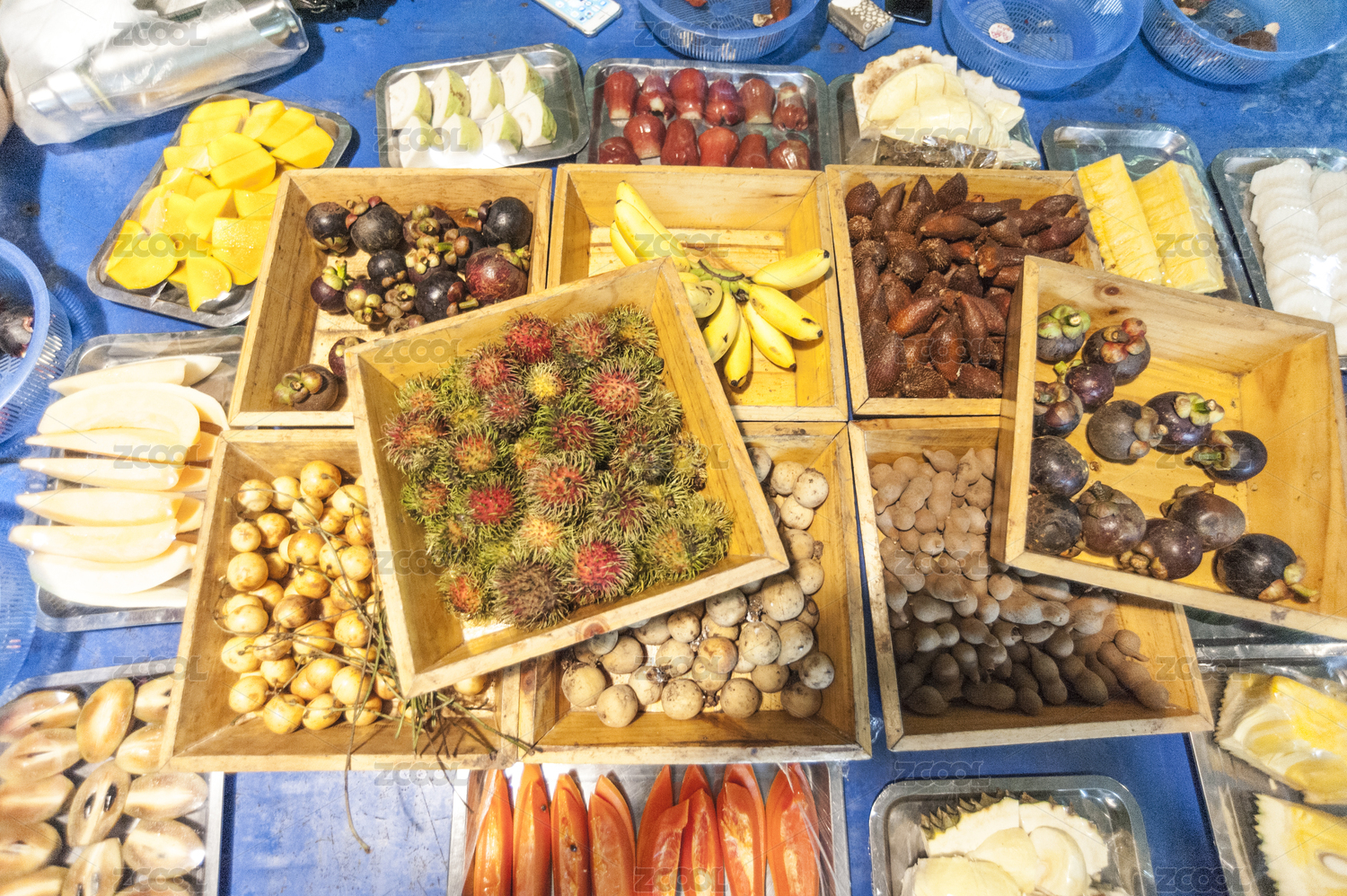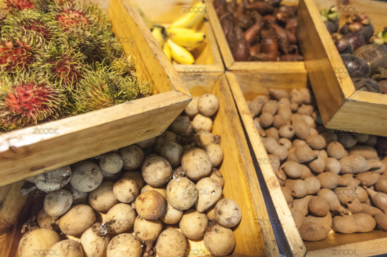 木箱中堆滿新鮮綠色的青檸和熱帶水果