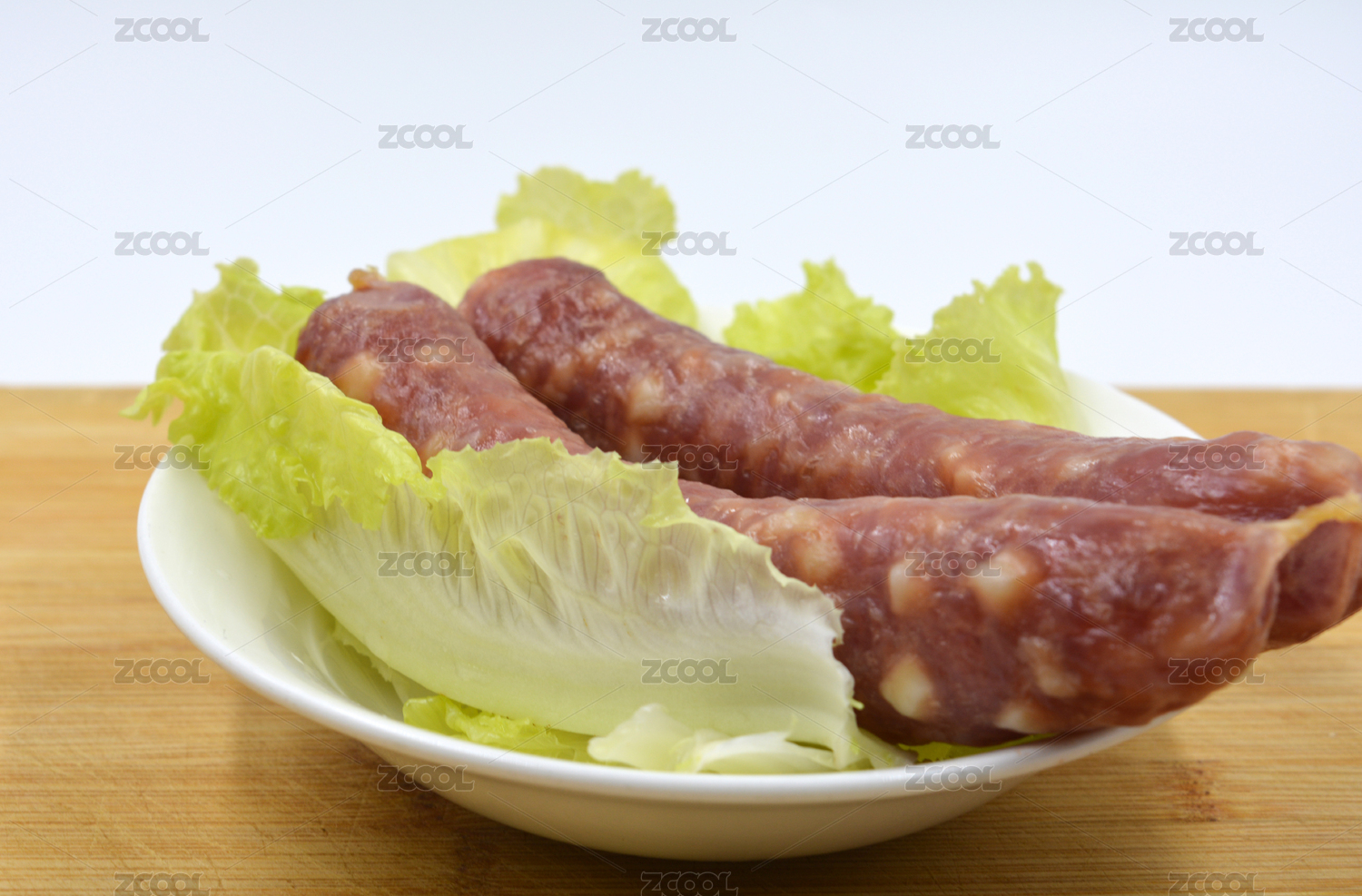 切菜板上的小盤子里裝著2根廣味香腸和幾片生菜,白色背景