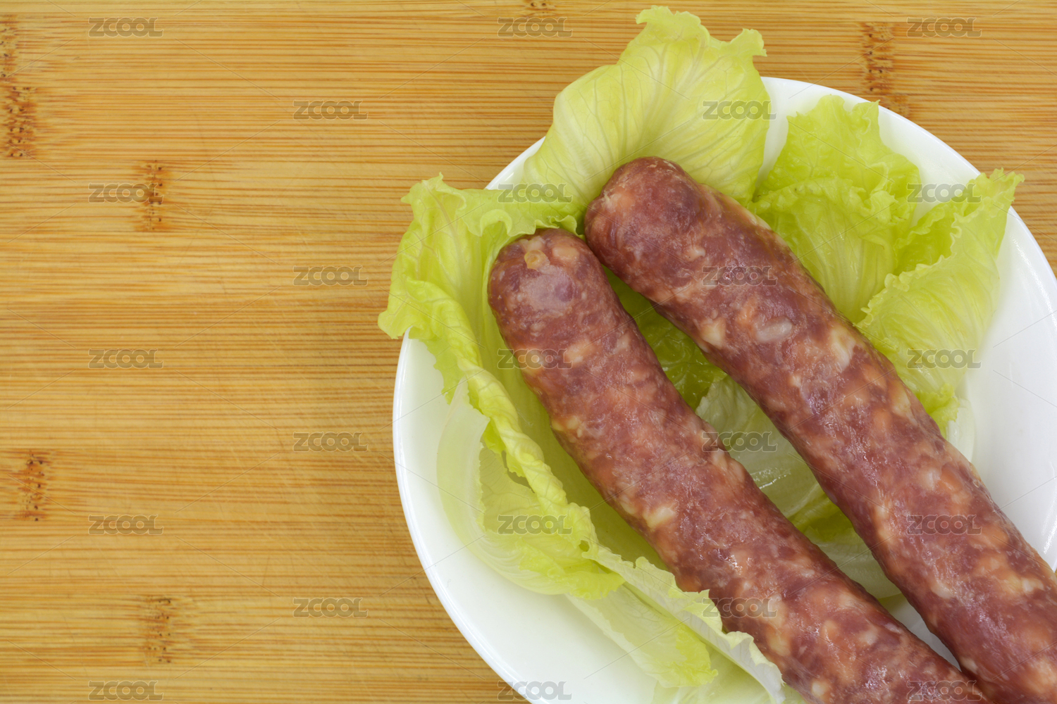 切菜板上的小盤子里裝著2根廣味香腸和幾片生菜