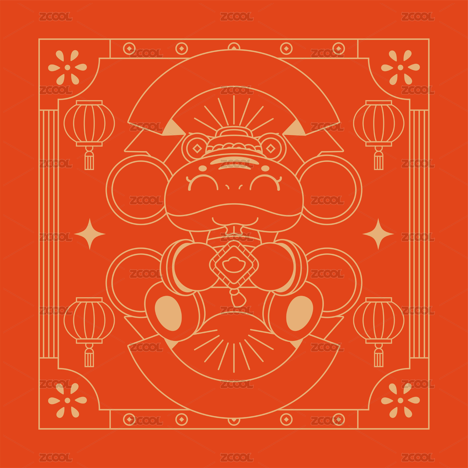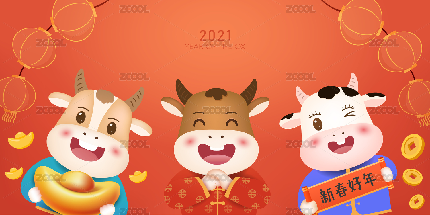 2021牛年卡通形象,紅色燈籠和春節(jié)海報(bào)