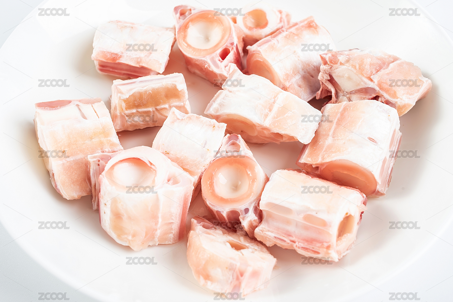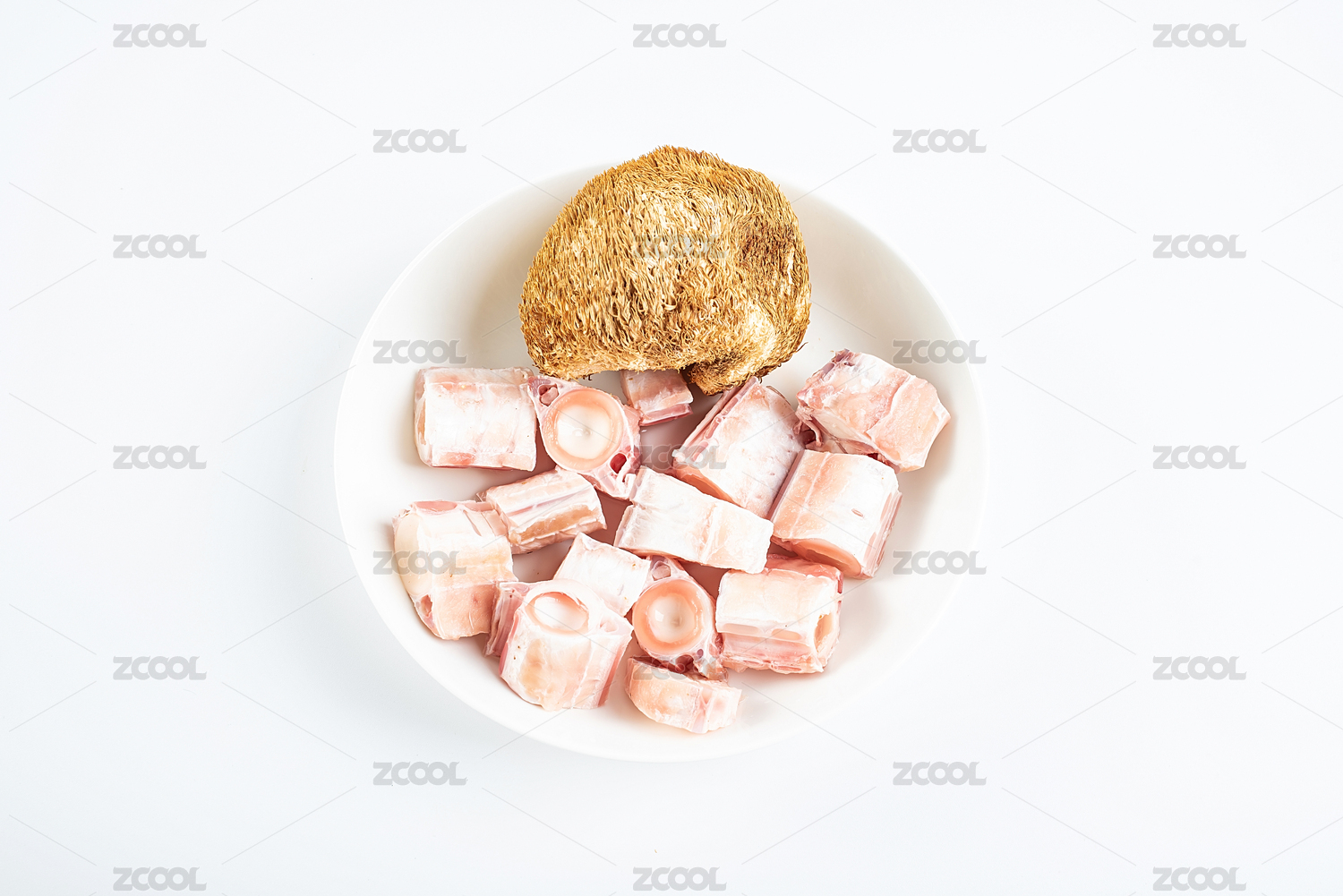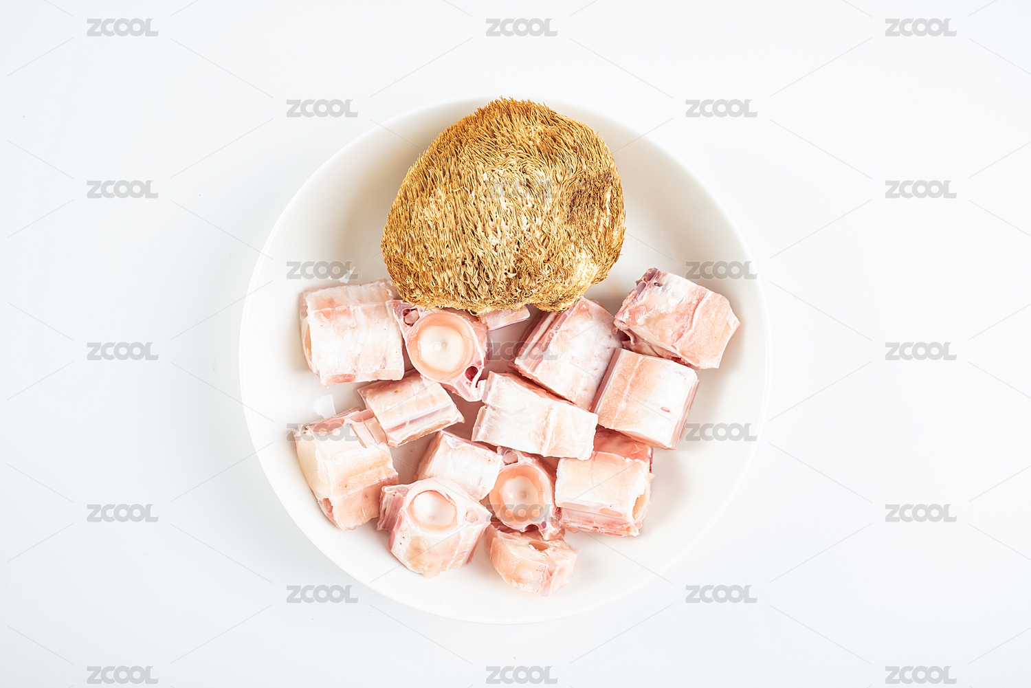 一碟新鮮鯊魚骨頭和猴頭菇煲湯湯料在白背景上