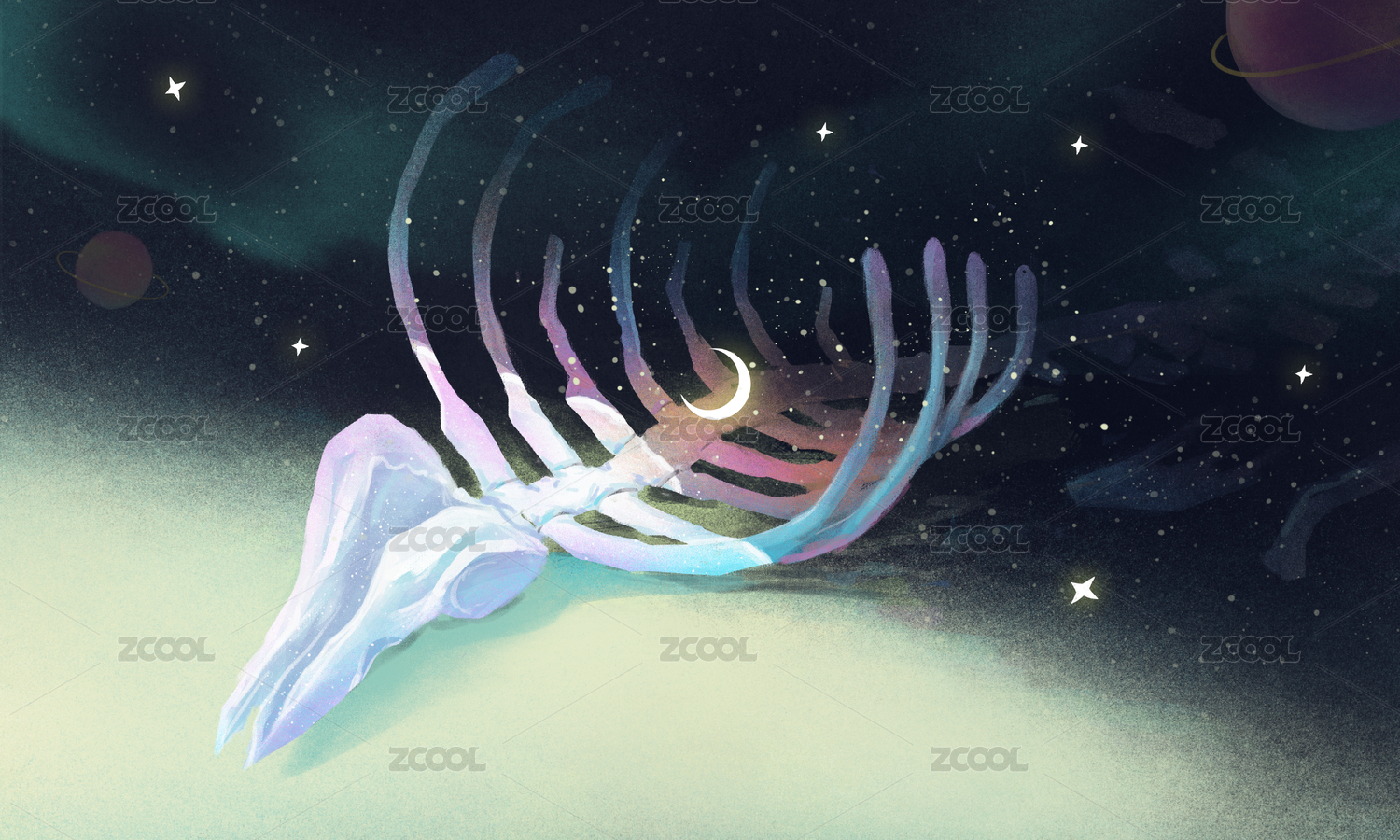 一副在海底深處的鯨魚骨頭叫鯨落星辰橫圖