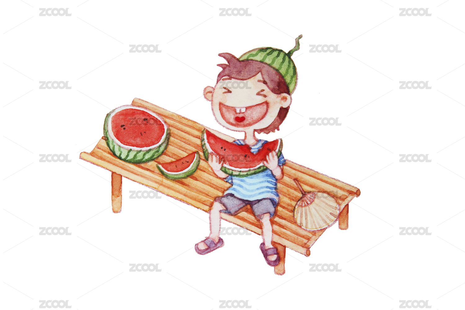 手繪吃西瓜的小孩