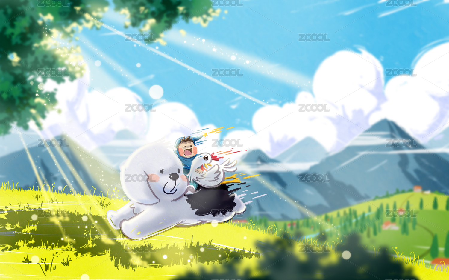 小孩騎著狗狗偷雞奔跑在草原上插畫壁紙