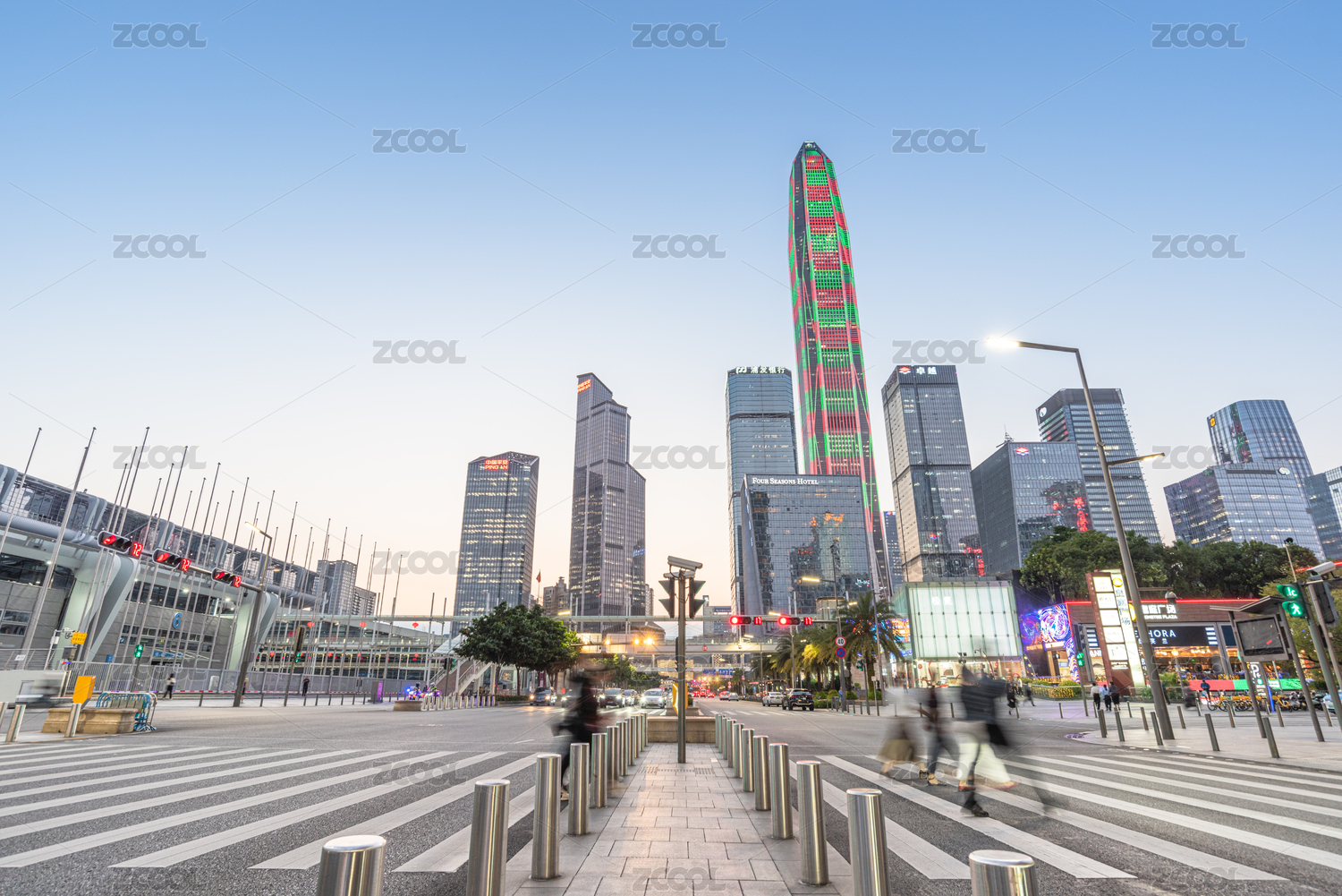 深圳福田CBD城市天際線和過馬路的行人