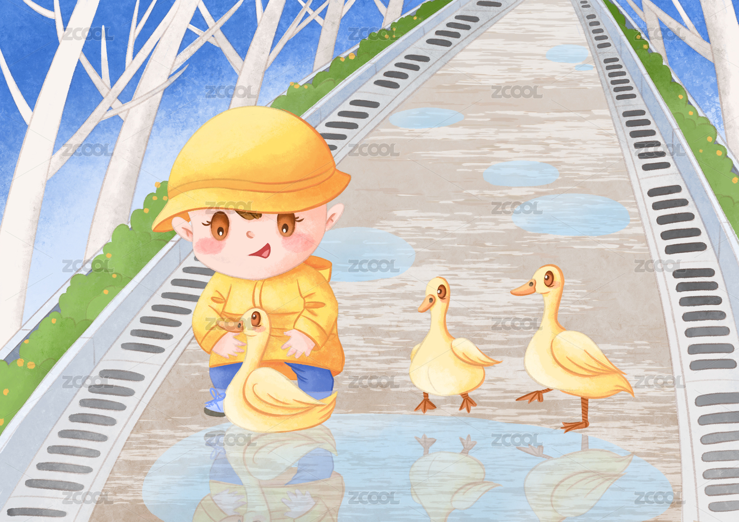 小男孩帶著小鴨子過馬路