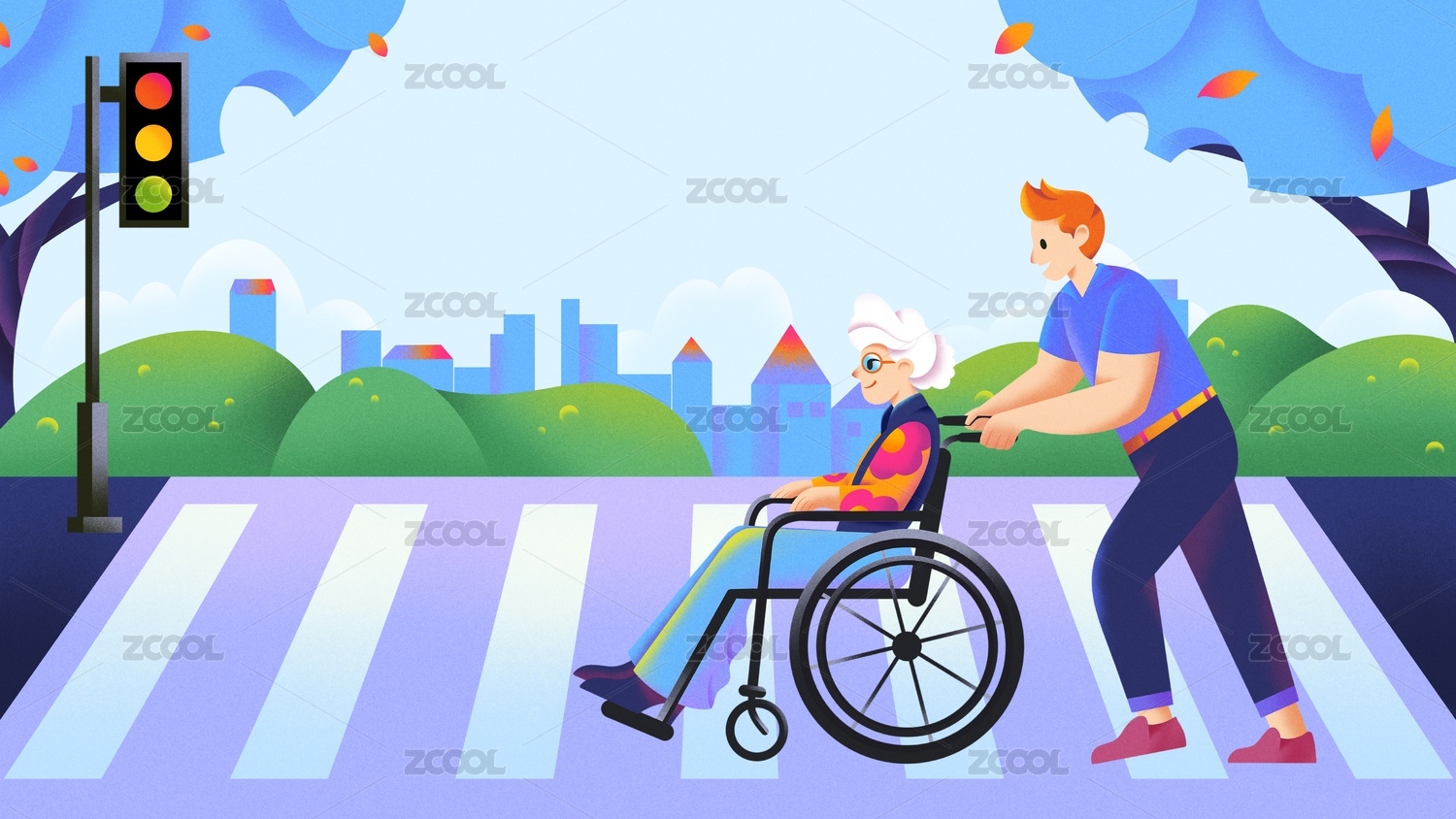 扁平噪點風(fēng)年輕人推著坐輪椅的老奶奶過馬路