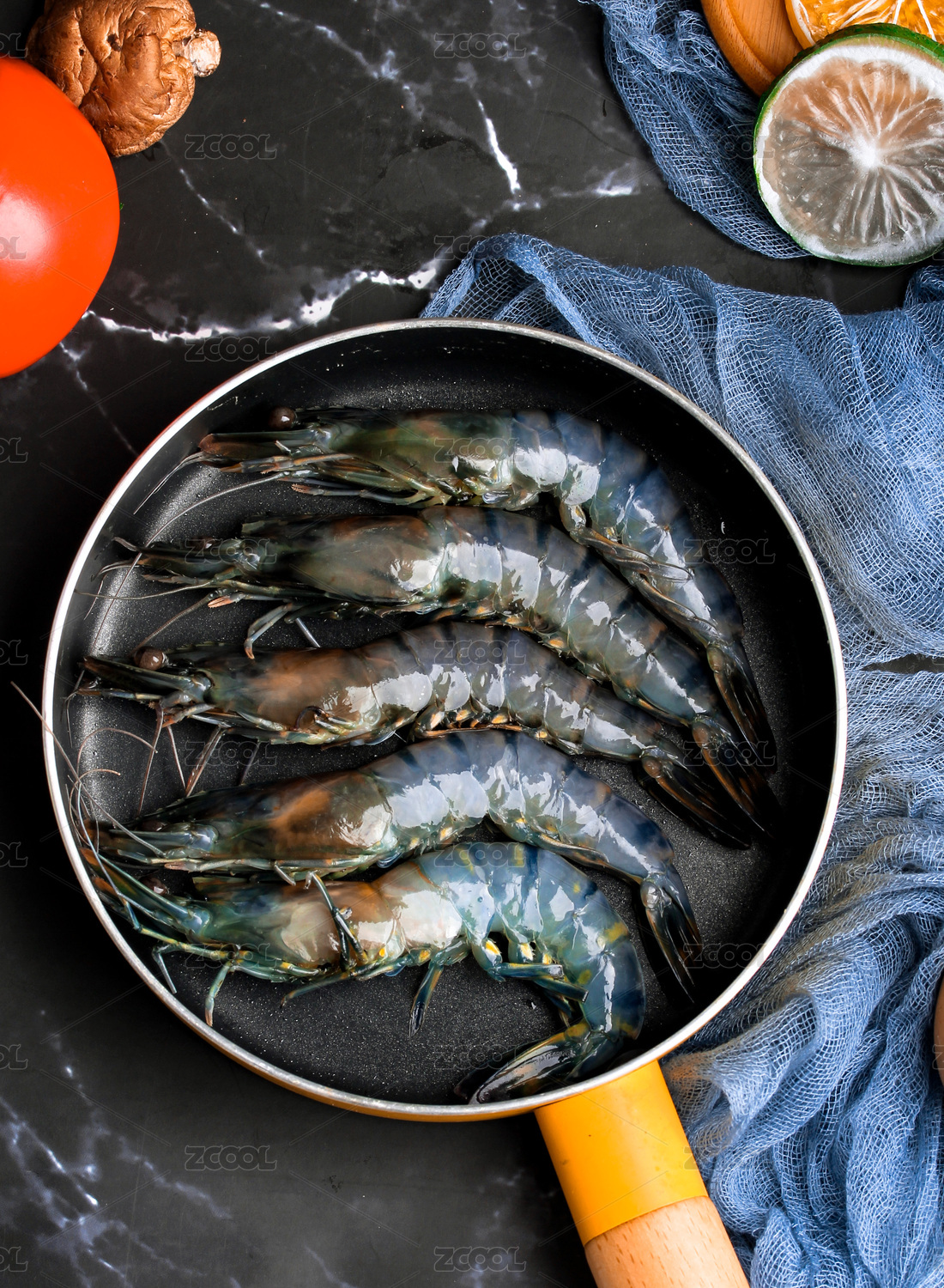 黑色大理石背景上鍋中生鮮黑虎蝦
