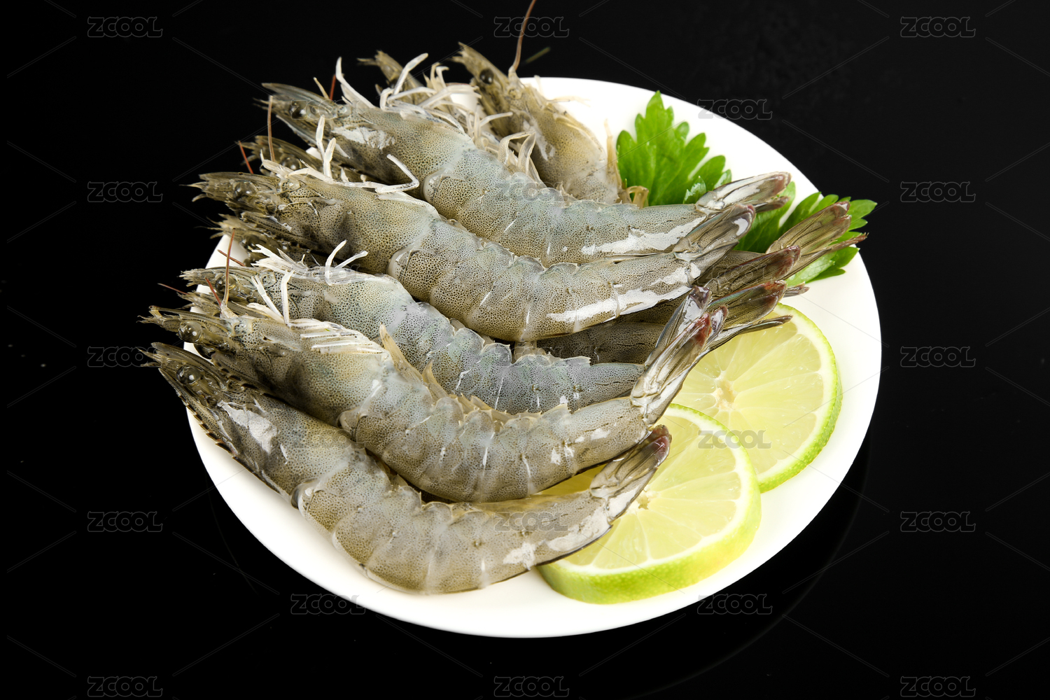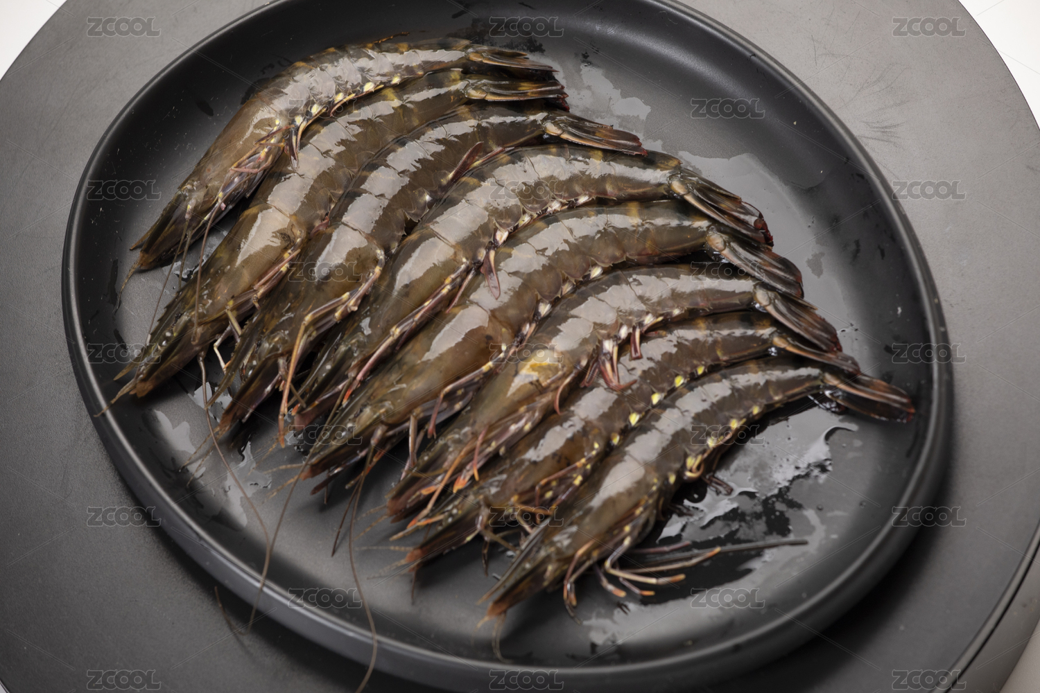 黑底上放著一盤新鮮大黑虎蝦