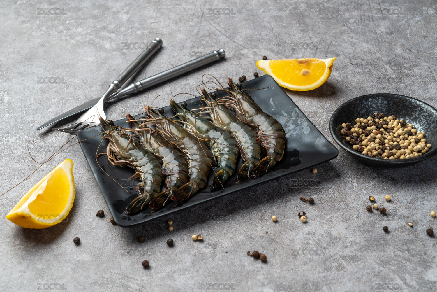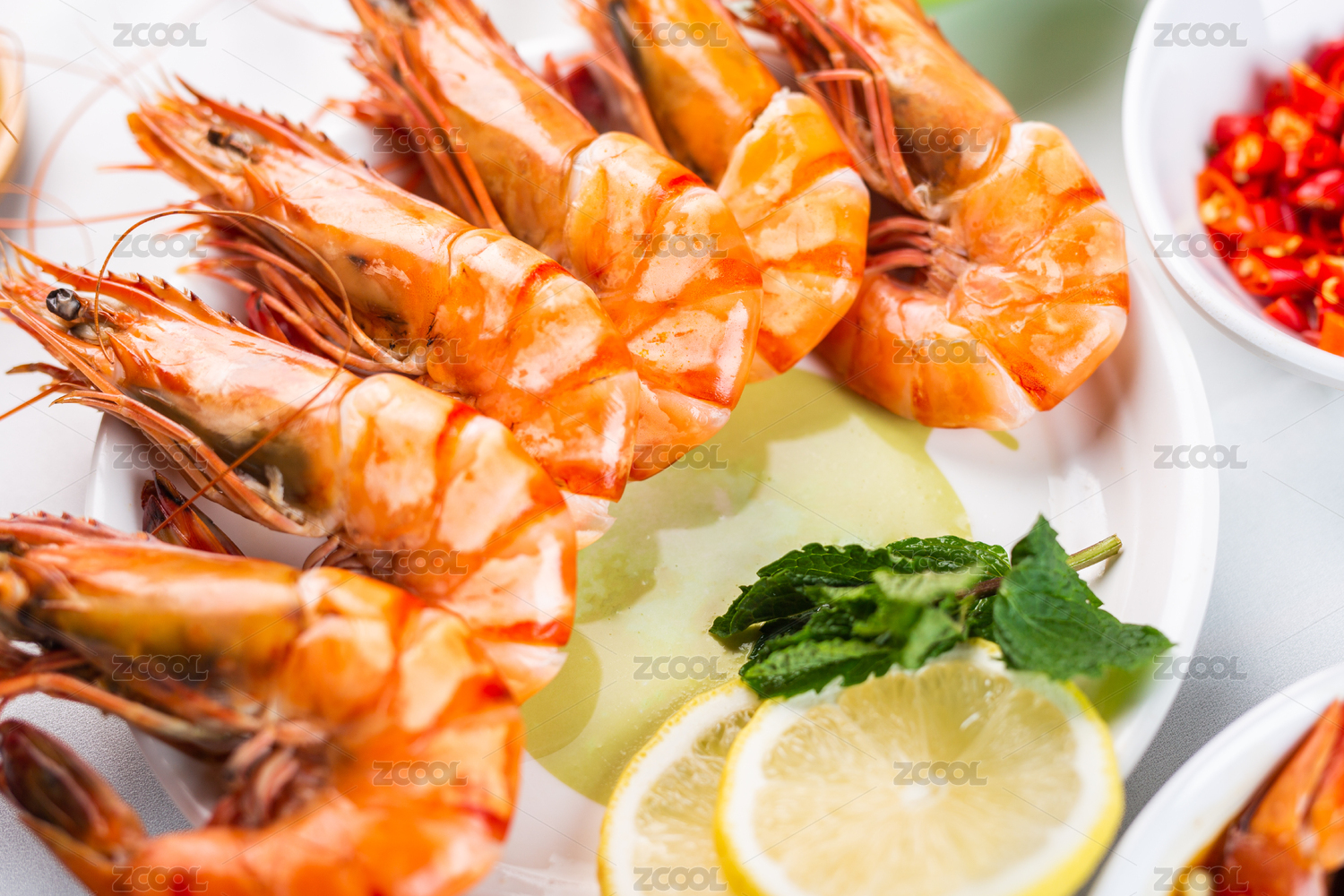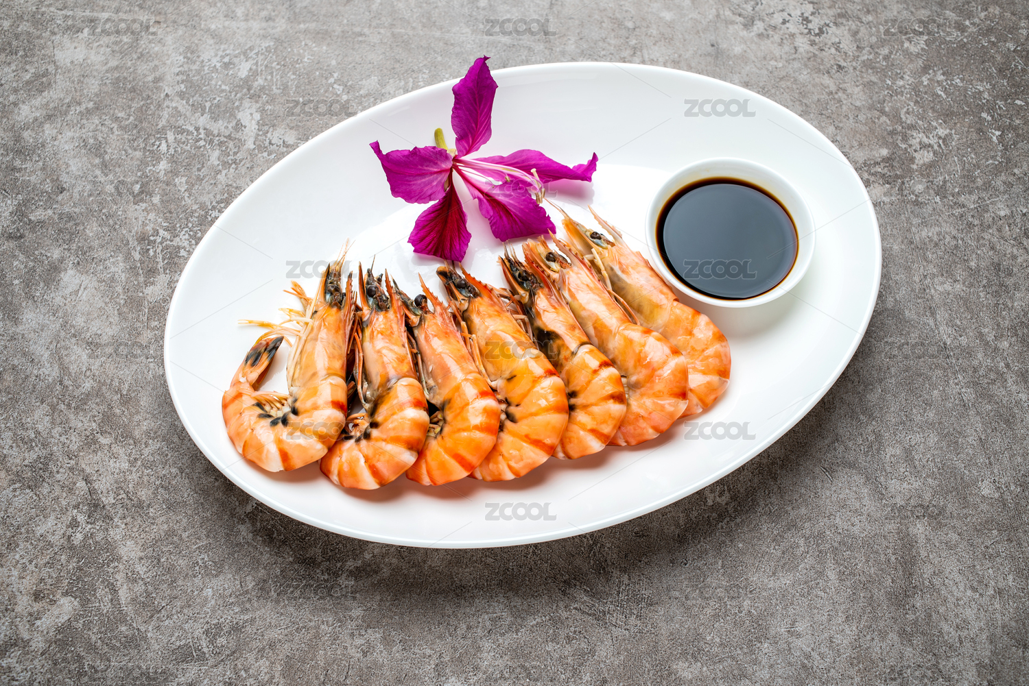 水泥底紋上一碟白灼黑虎蝦和調(diào)味醬
