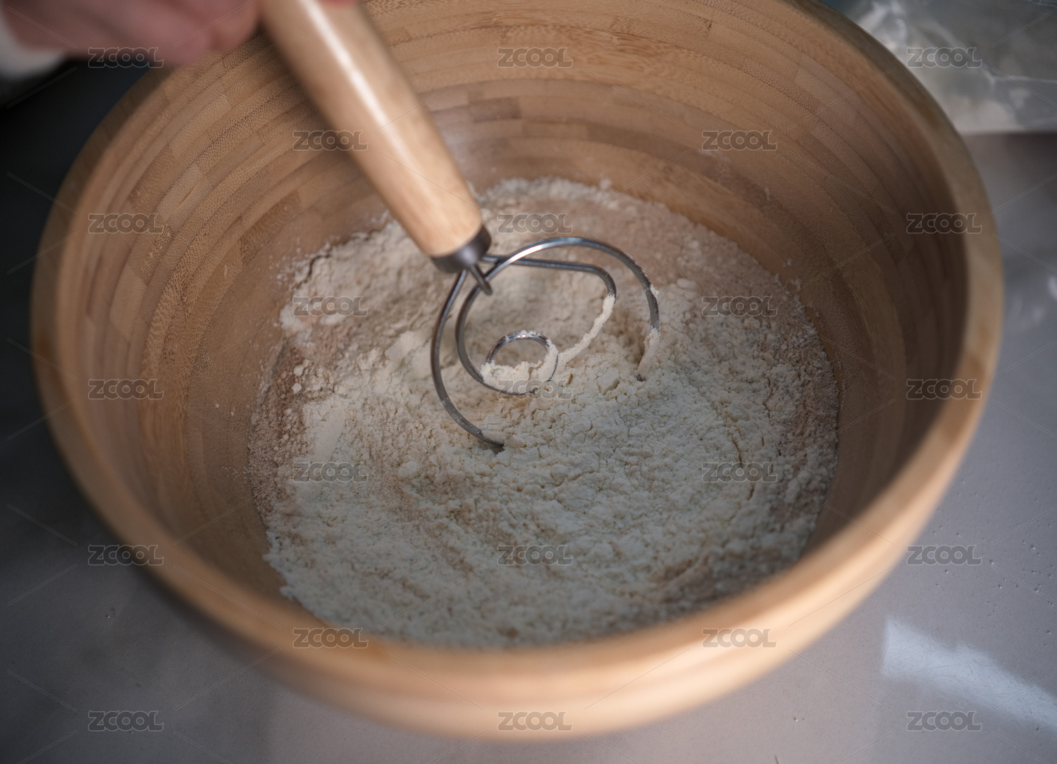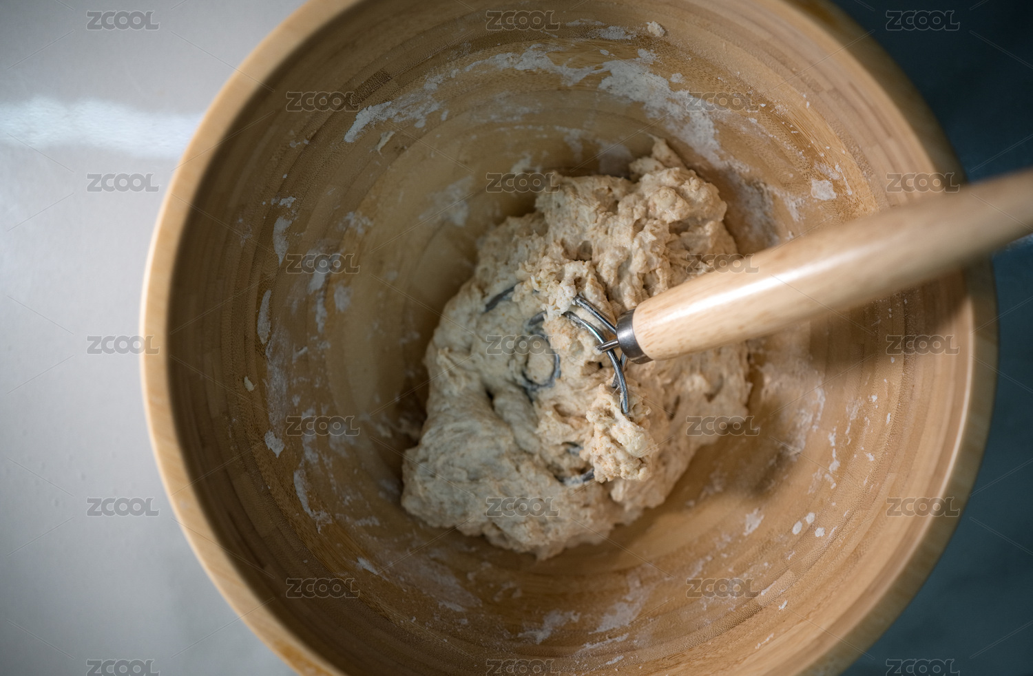 木碗中攪拌面團的場景