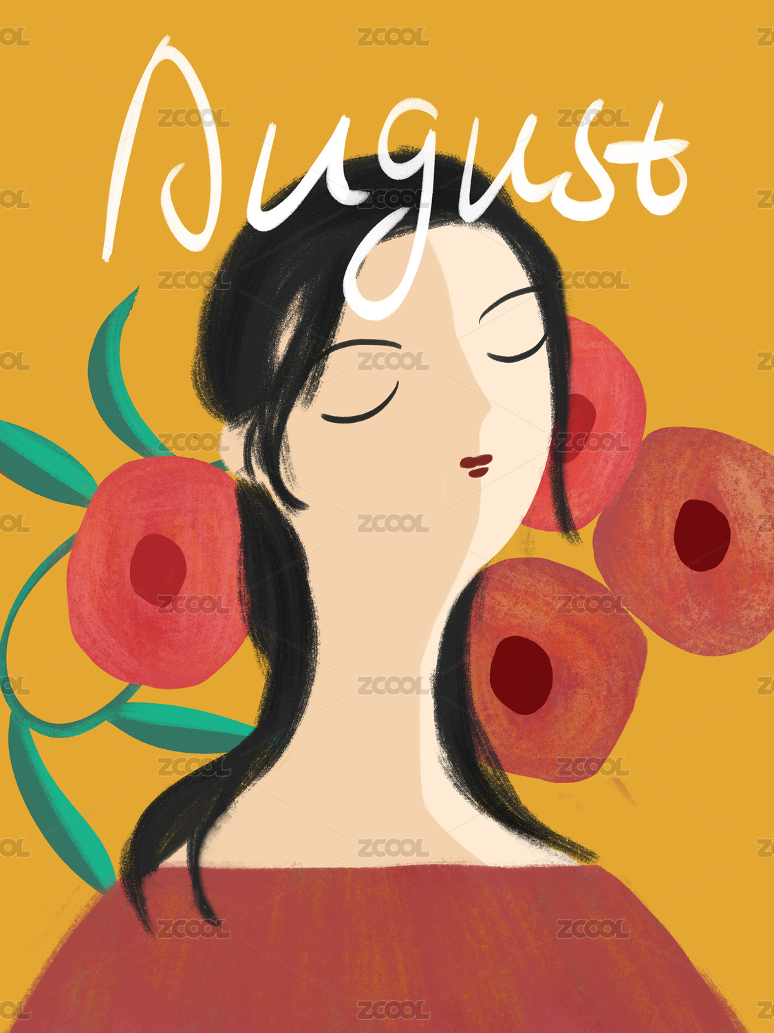 清新月份日歷女孩和花八月插畫