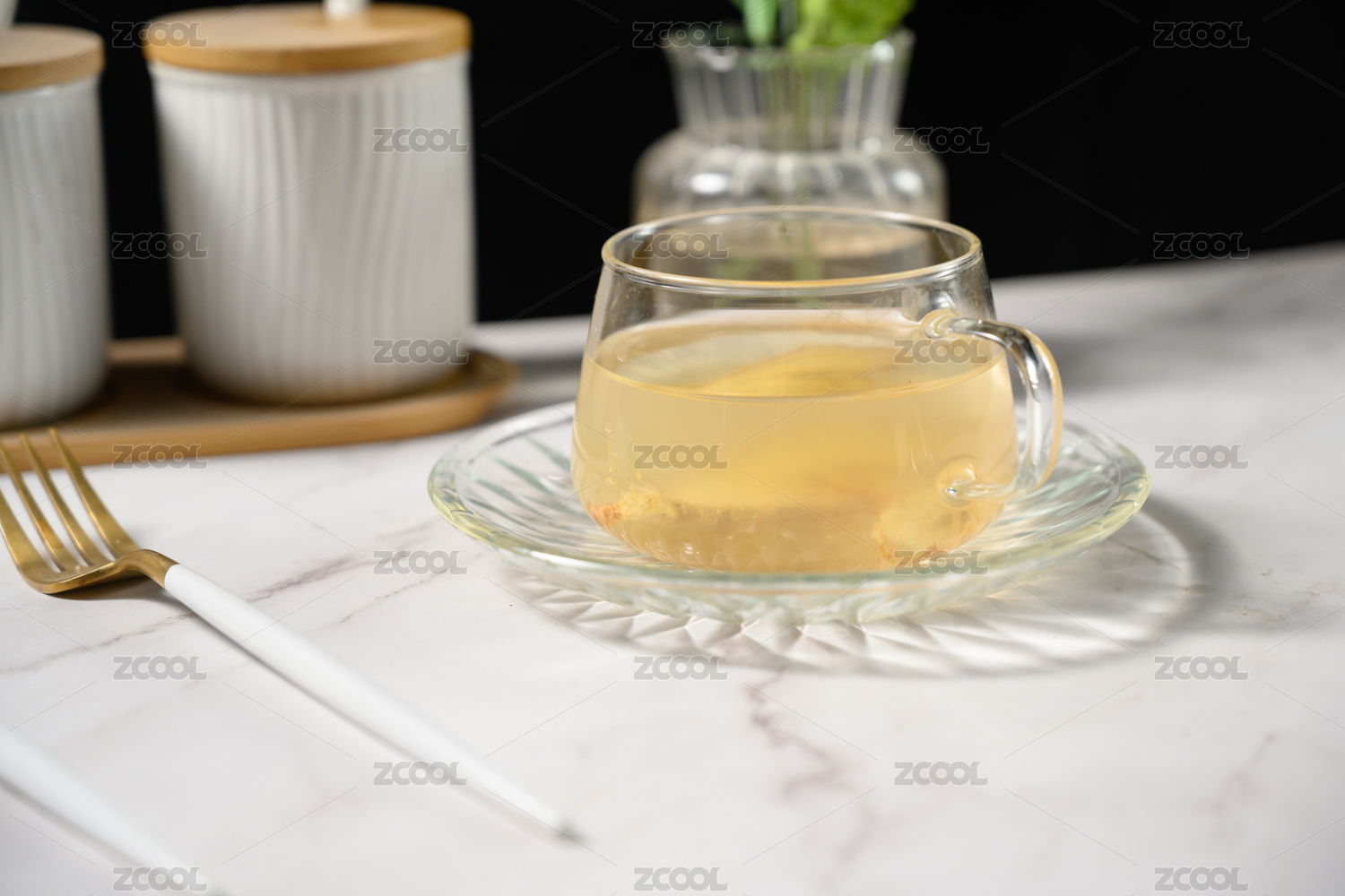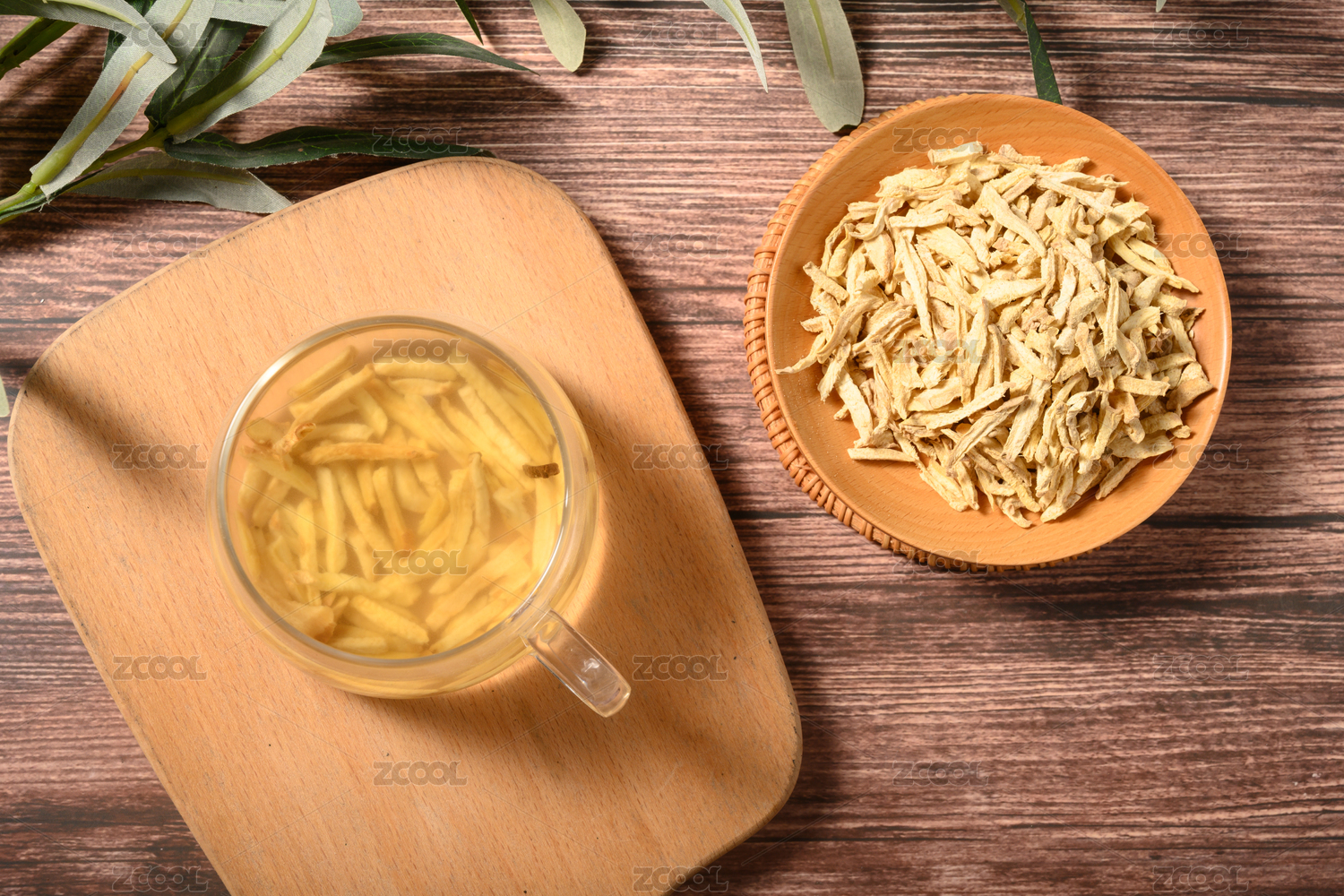 桌面上的盤子里的美味的姜絲干和姜茶