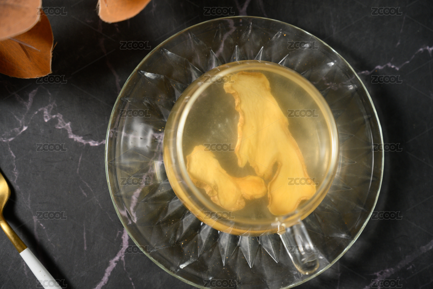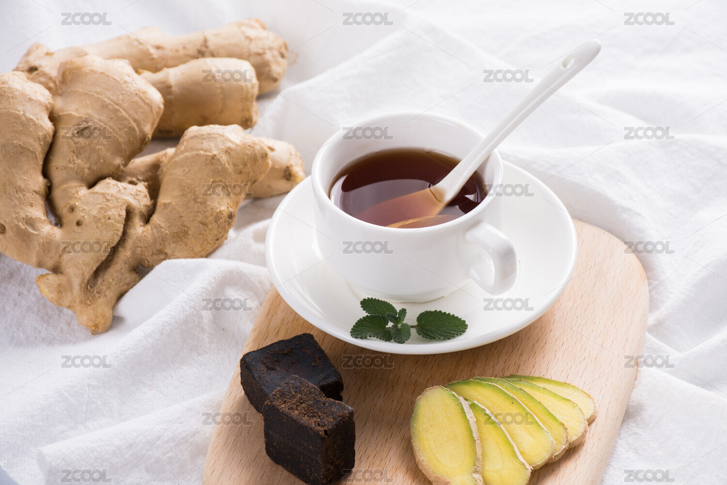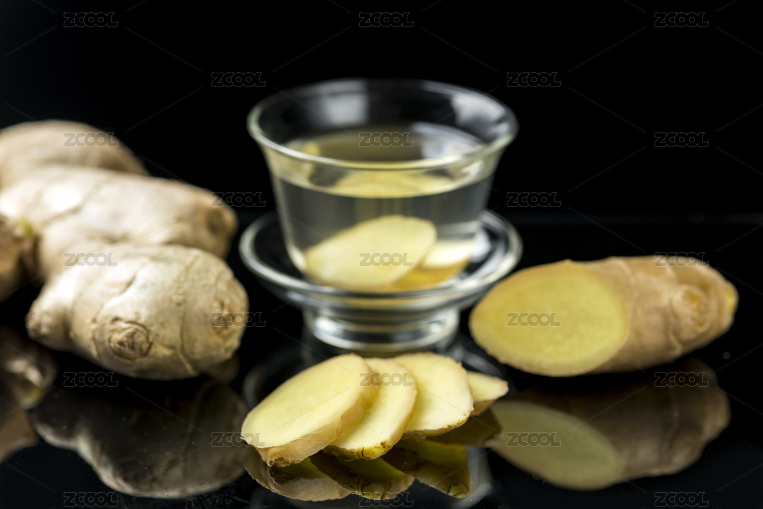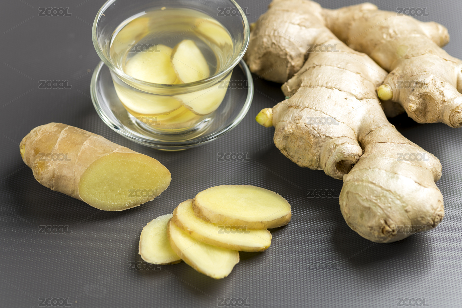 生姜與姜片姜茶擺放在桌面上特寫