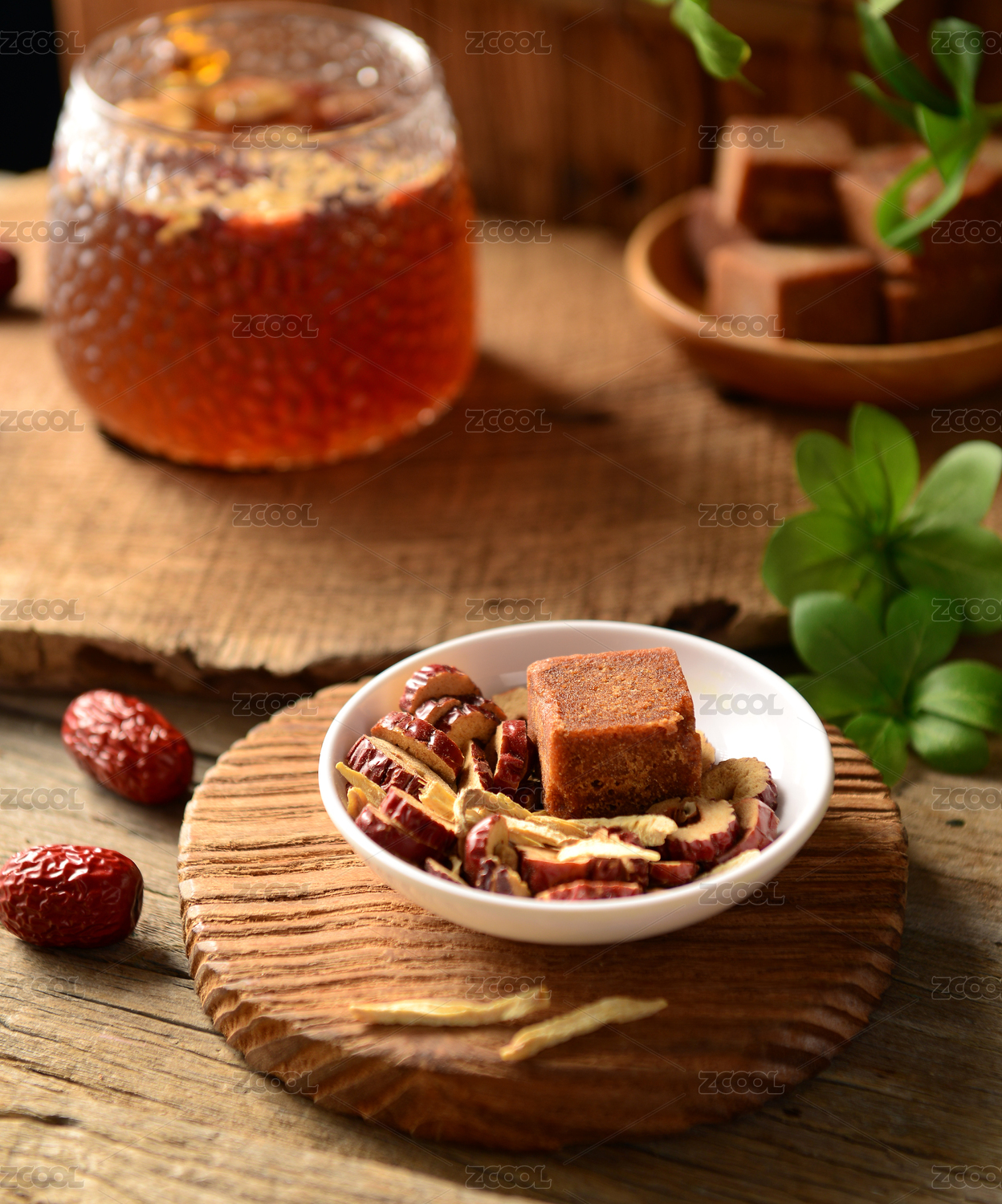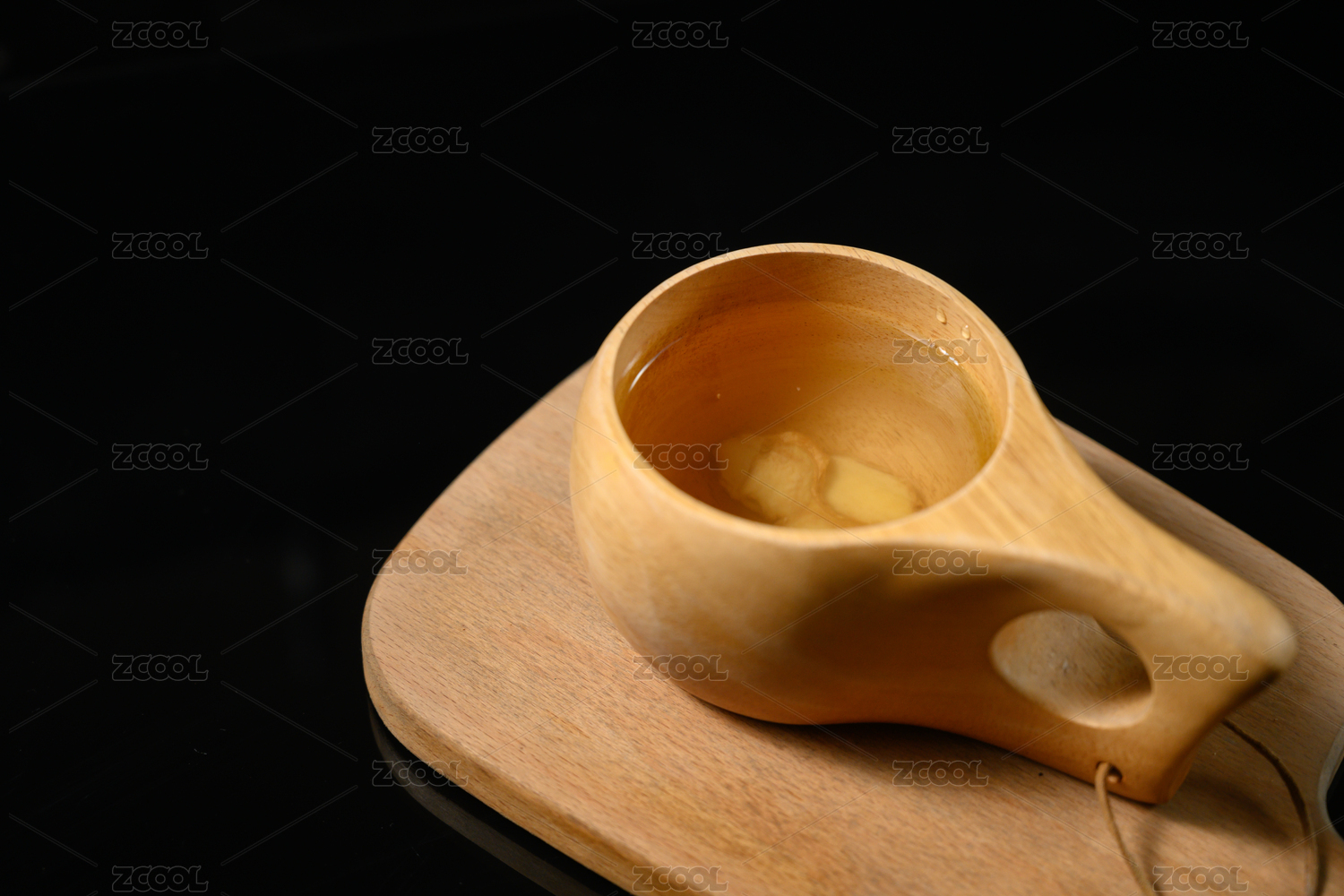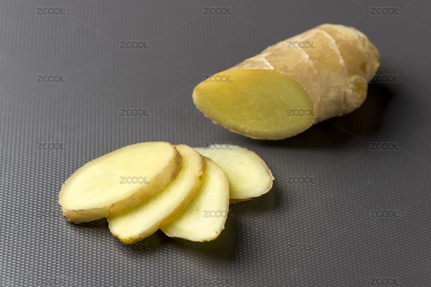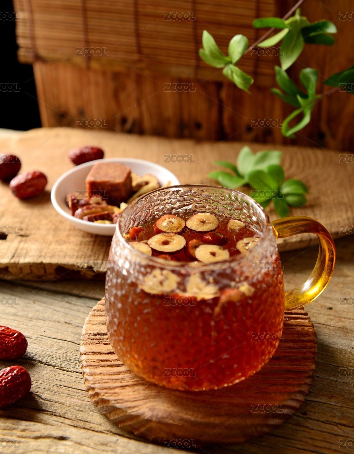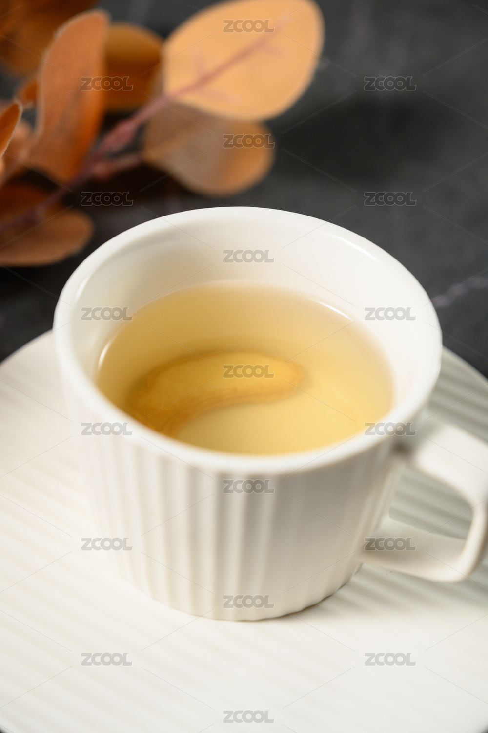 生姜與姜片姜茶擺放在桌面上特寫