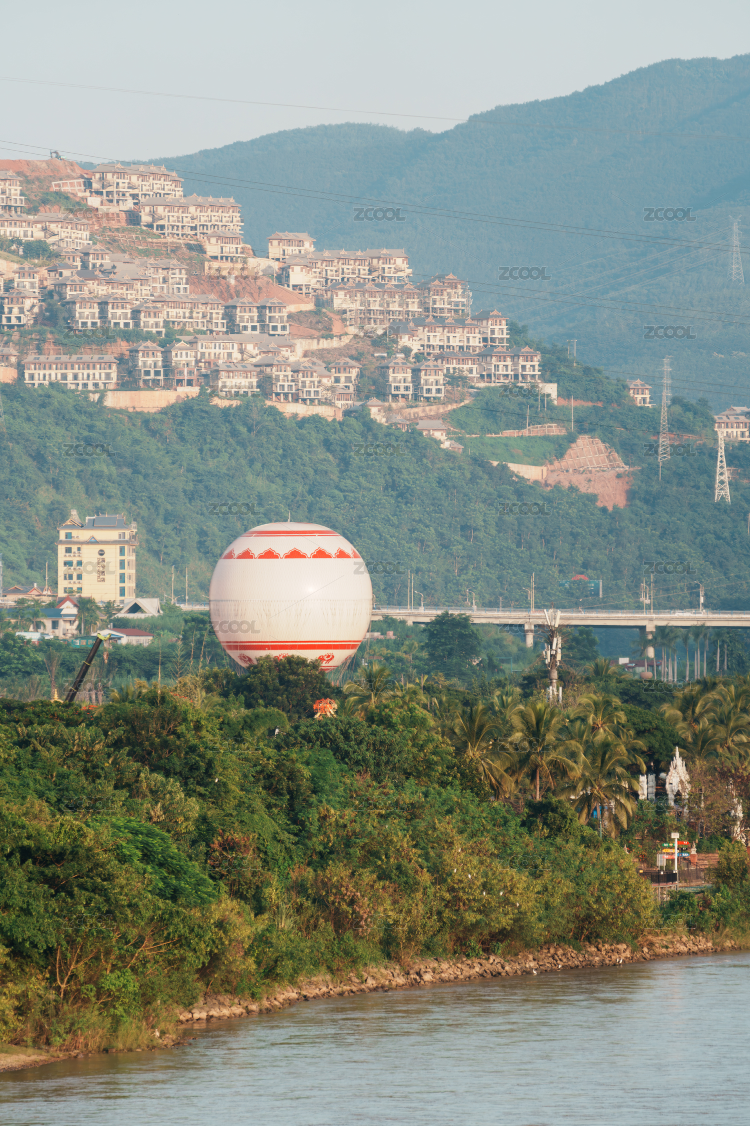 山水間帶建筑的大型紅白熱氣球景觀