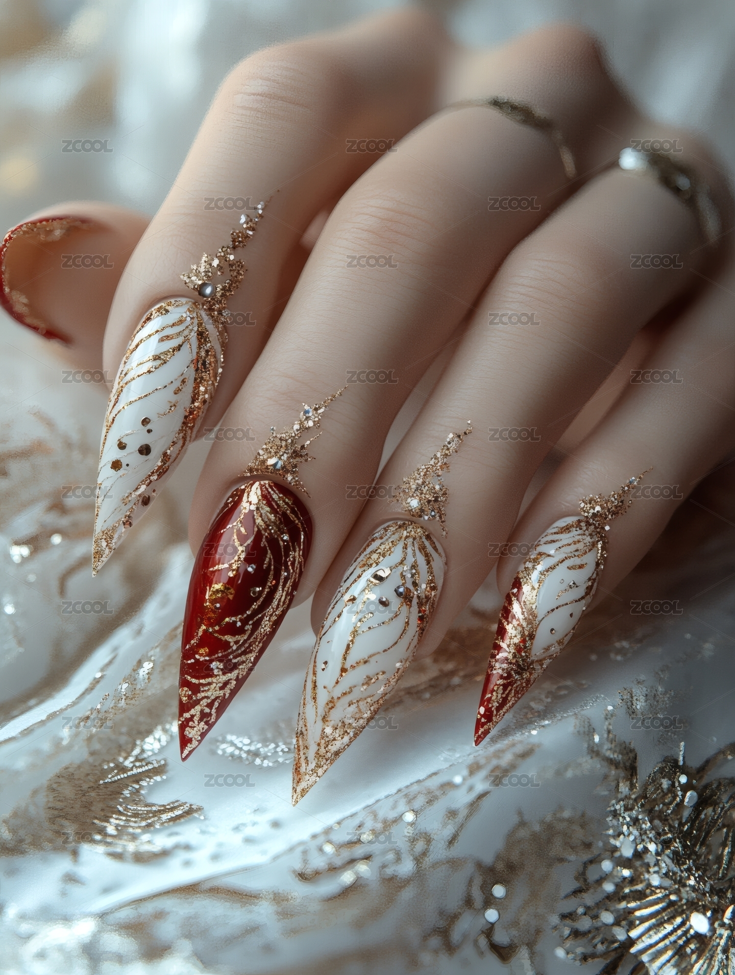 紅白配色精致金飾美甲