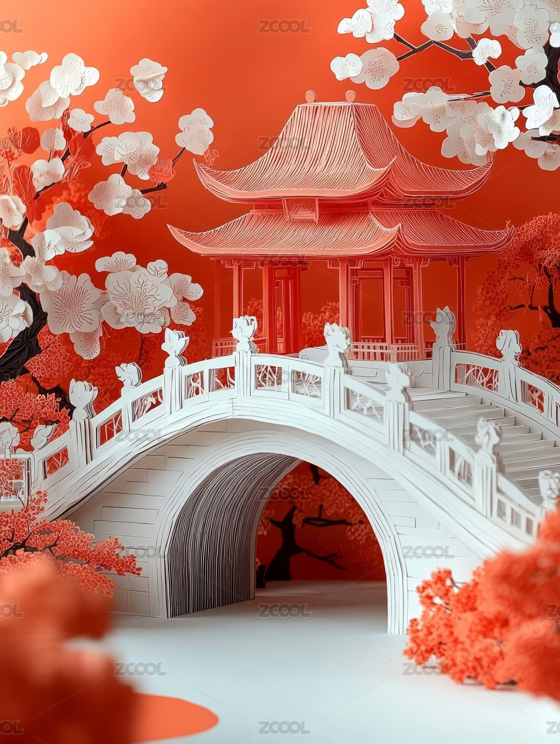 紅白配色中式建筑立體剪紙風(fēng)格背景
