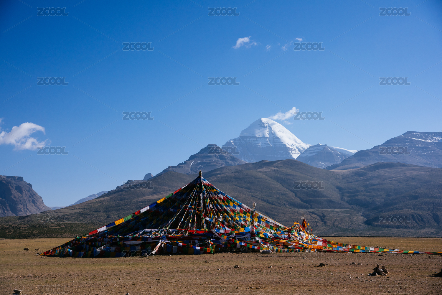 中國(guó)西藏,莊嚴(yán)的岡仁波齊山與飄揚(yáng)的經(jīng)幡
