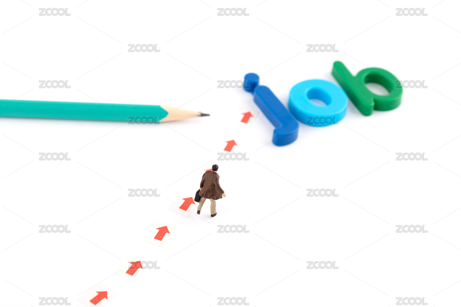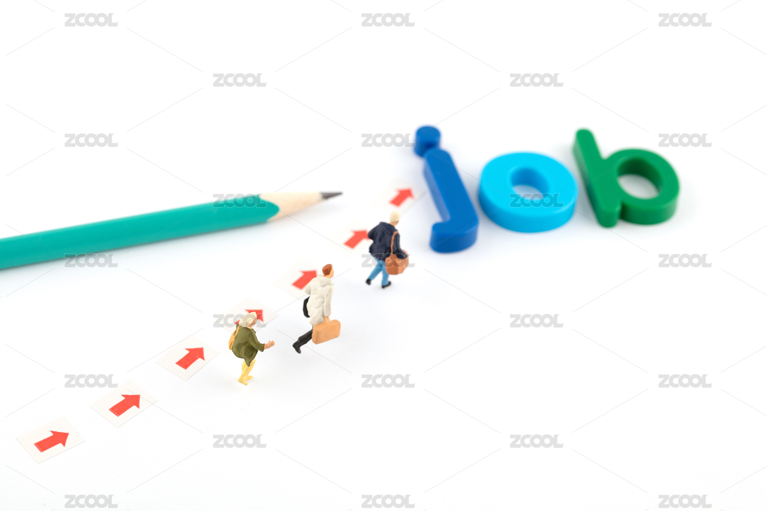 藍(lán)色背景下臺(tái)燈鉛筆和面試人群微縮創(chuàng)意圖