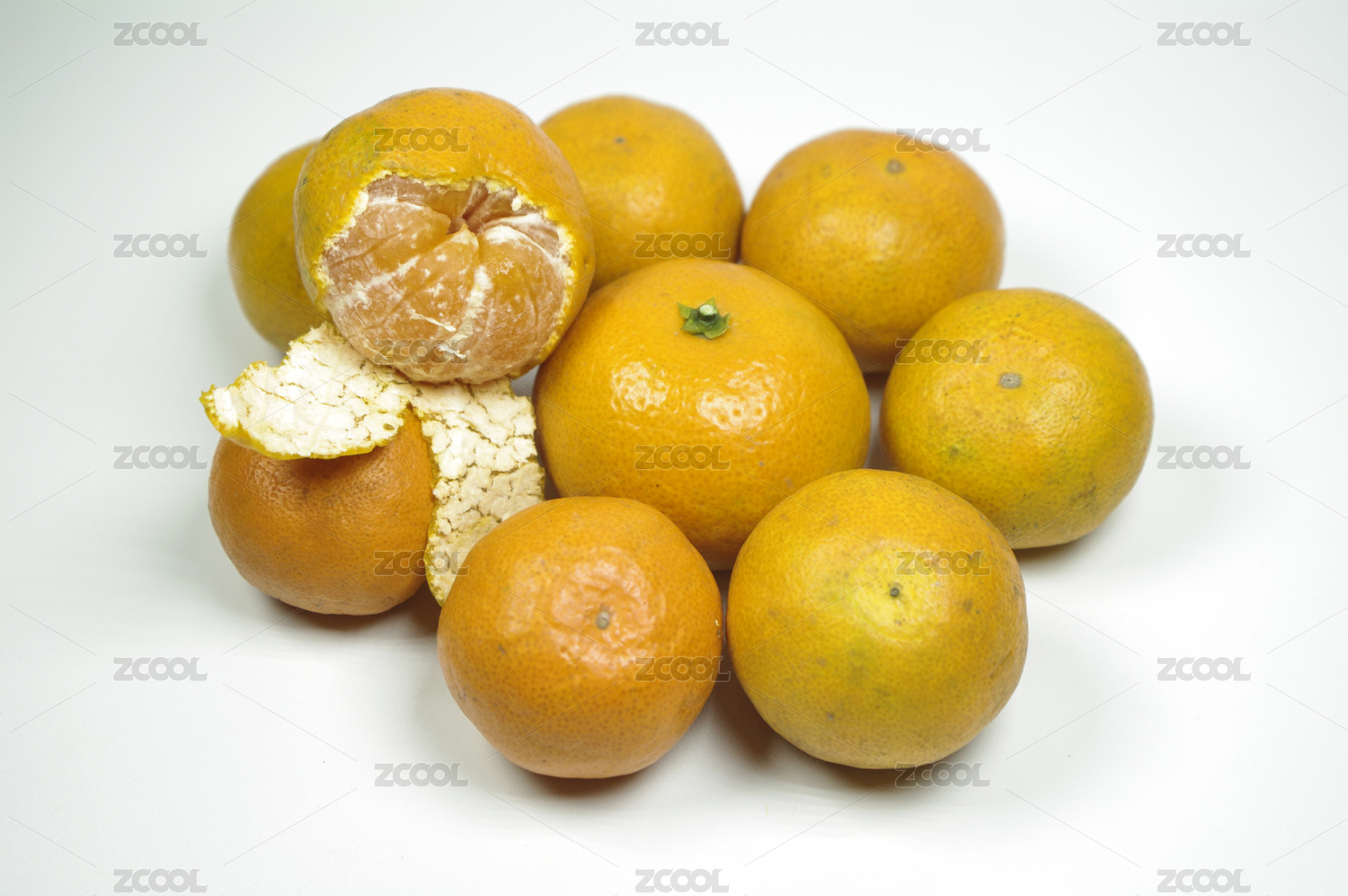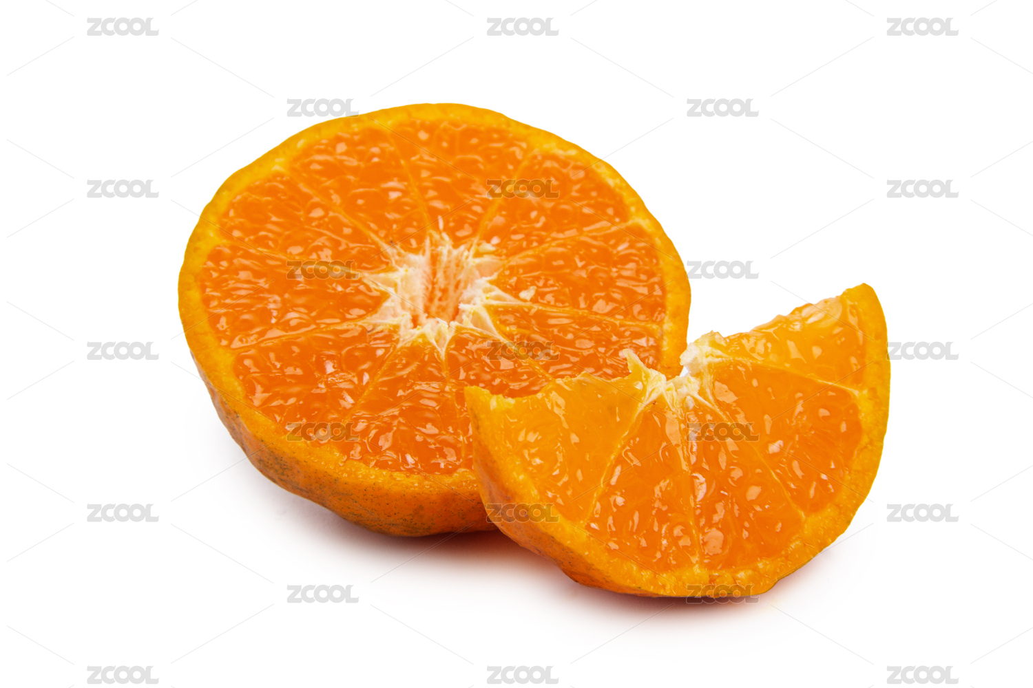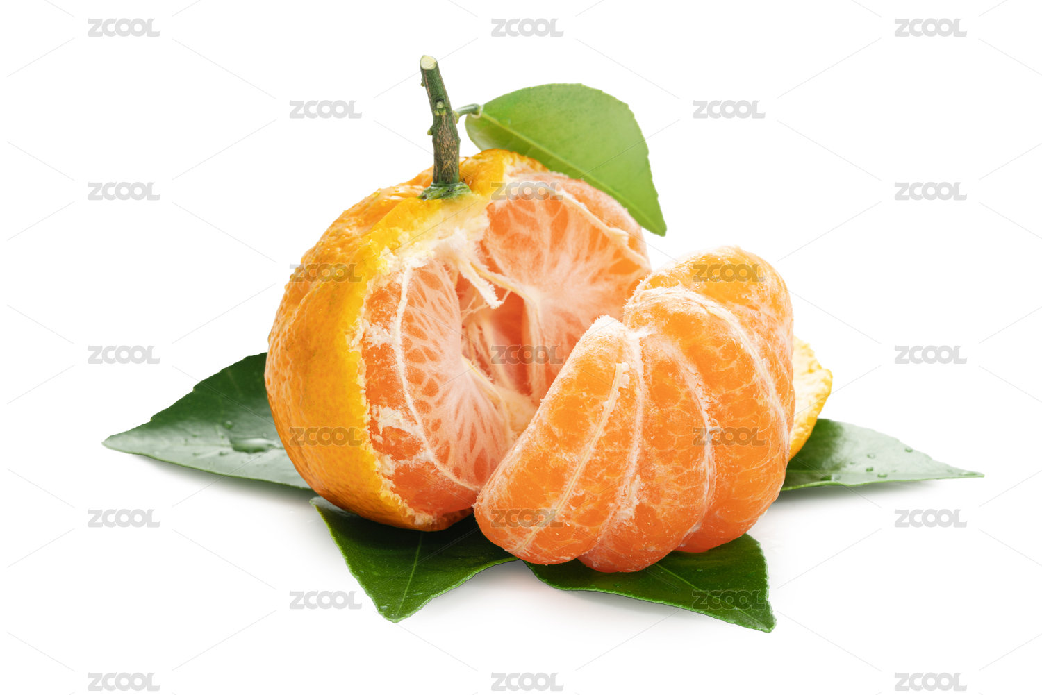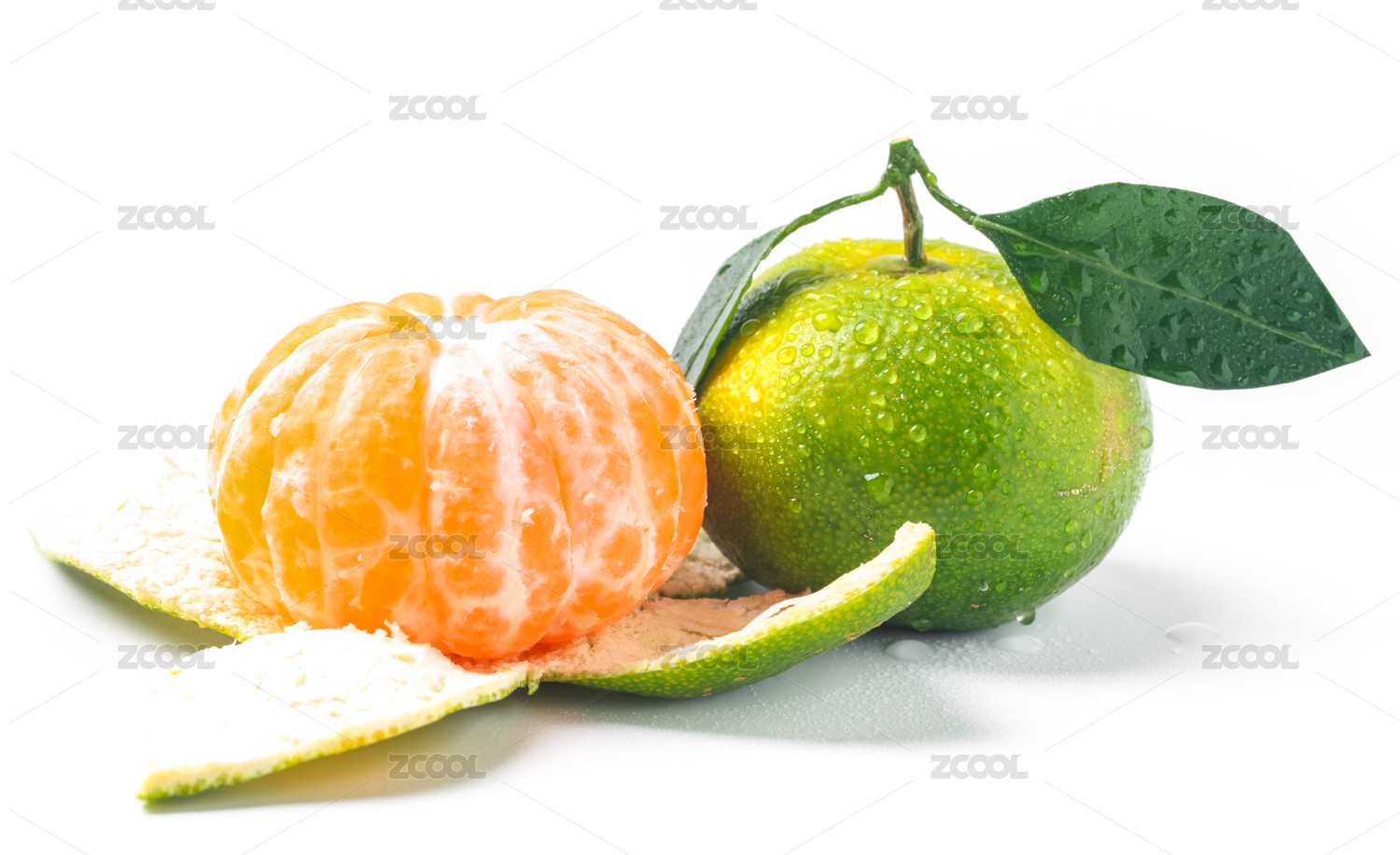白底上一個完整的蜜桔和一個剝皮的蜜桔果肉