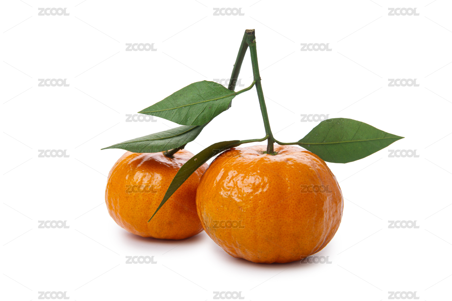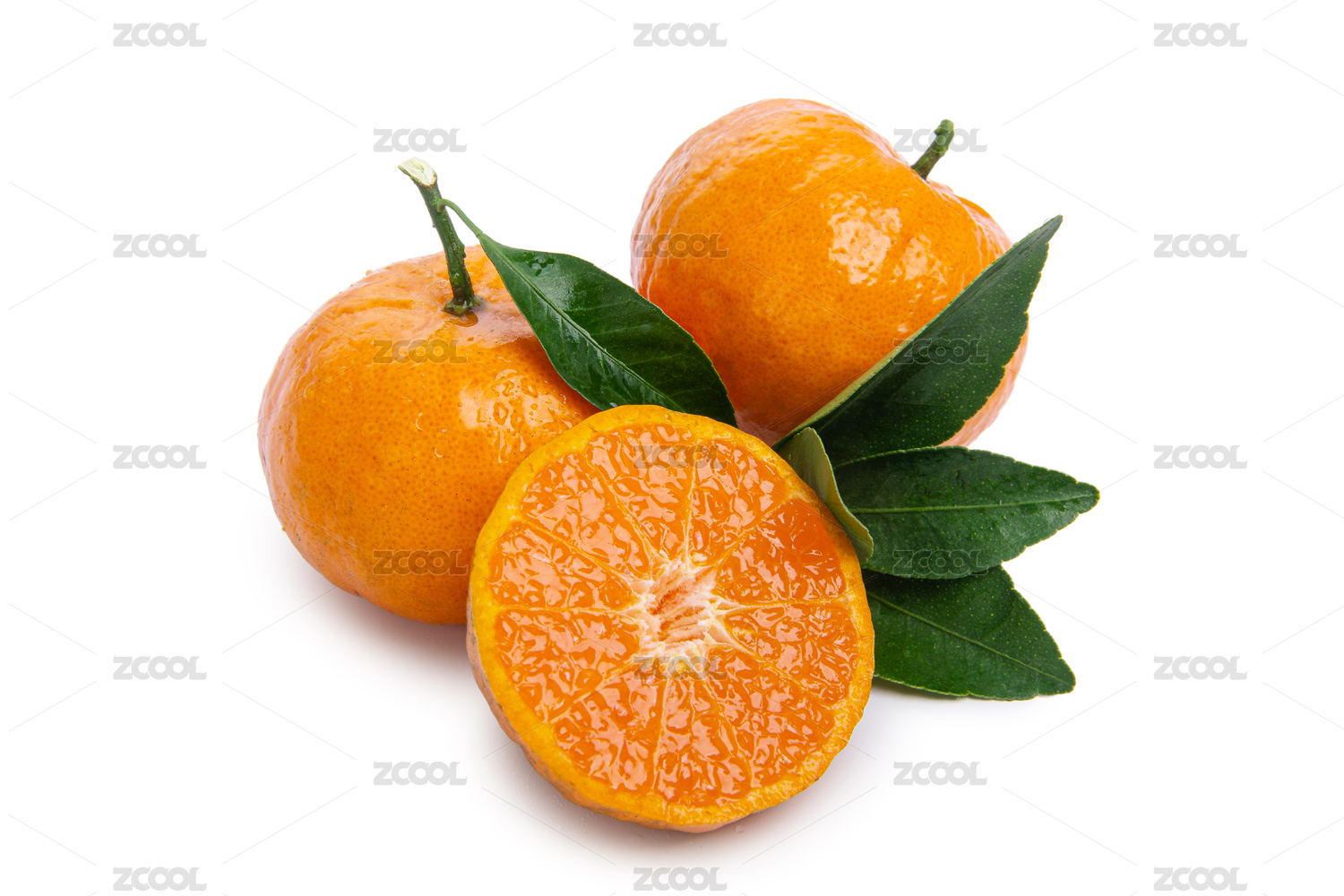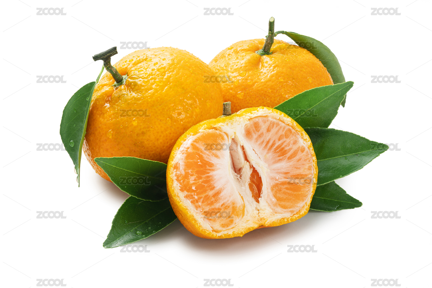 白底上一個完整的蜜桔和一個剝皮的蜜桔果肉