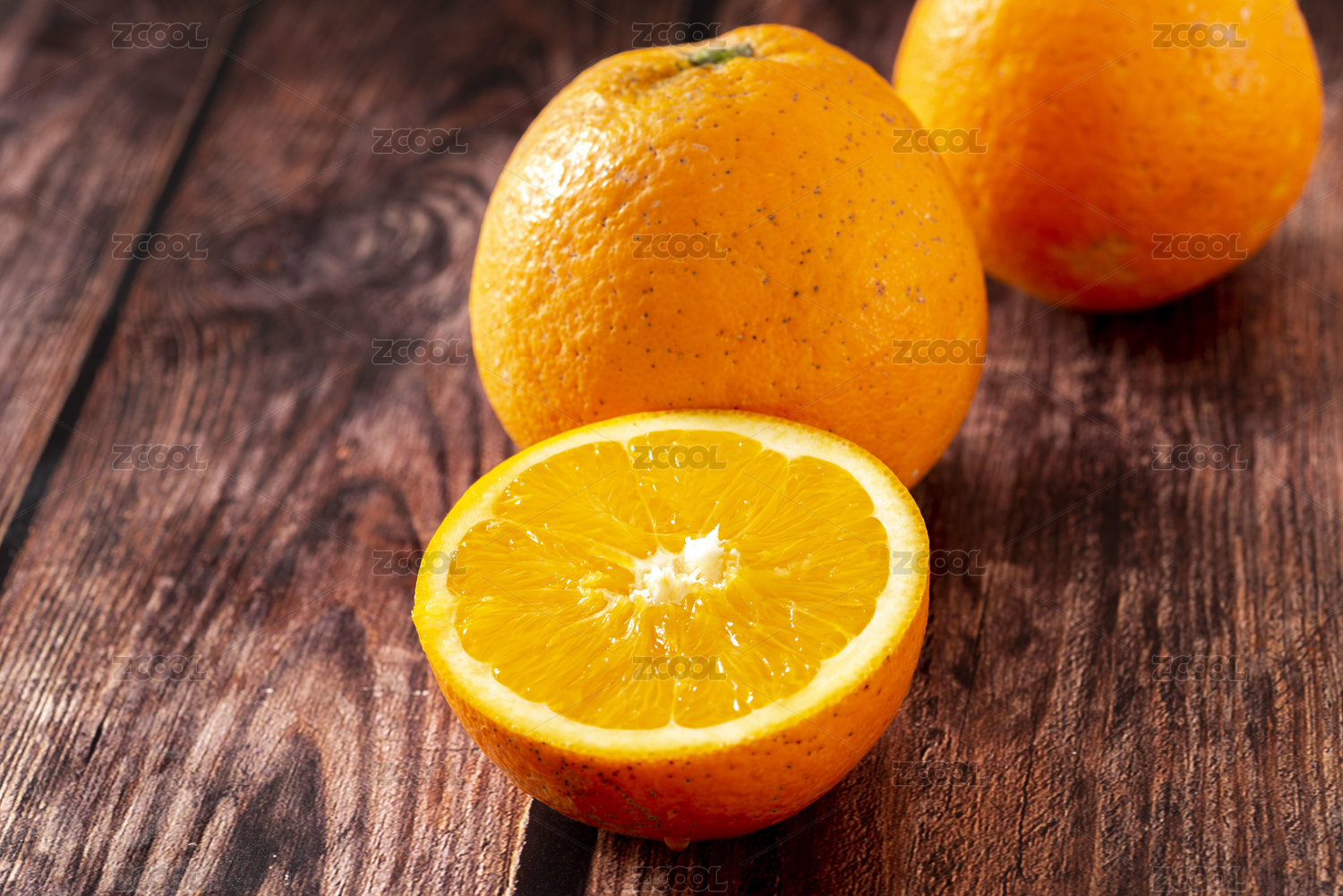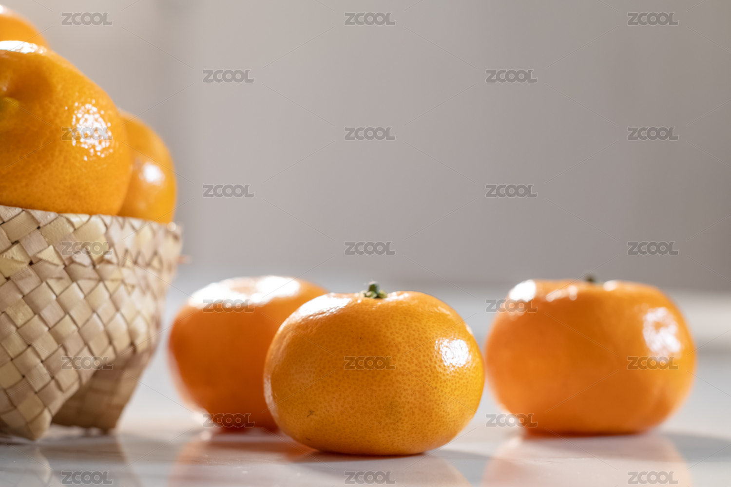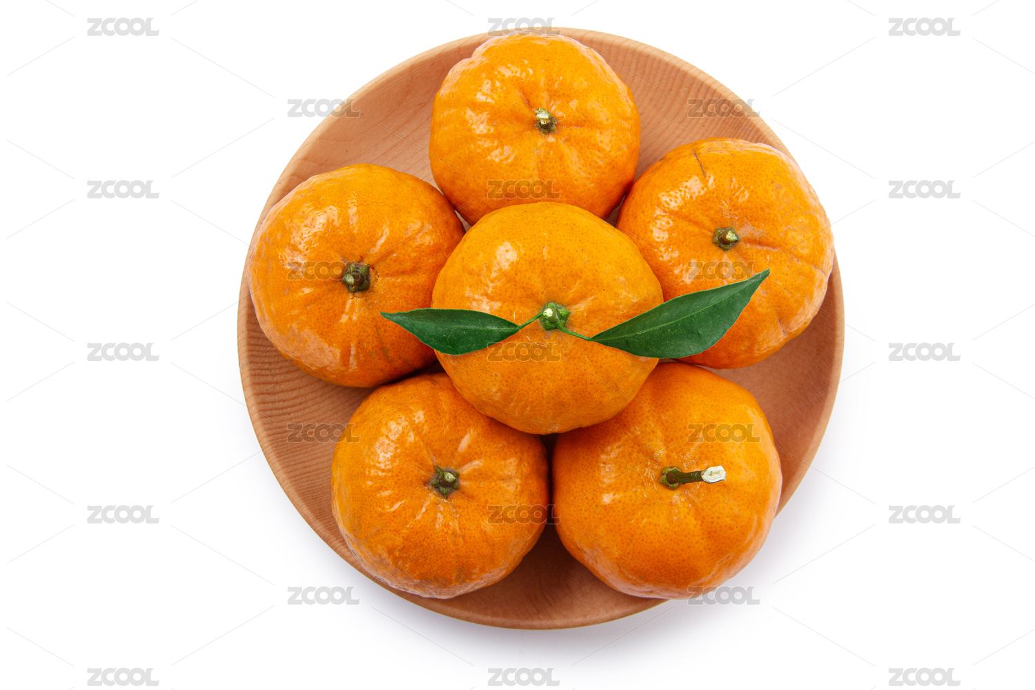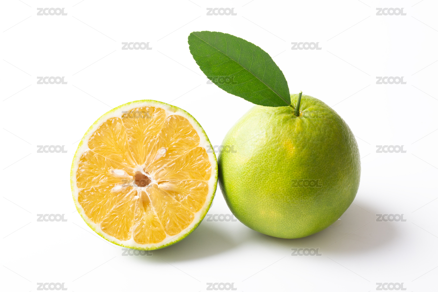 白底上一個完整的蜜桔和一個剝皮的蜜桔果肉