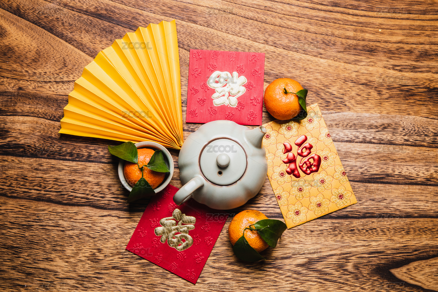 正上方視角特寫放在木桌上的扇子,紅包袋,桔子和茶具