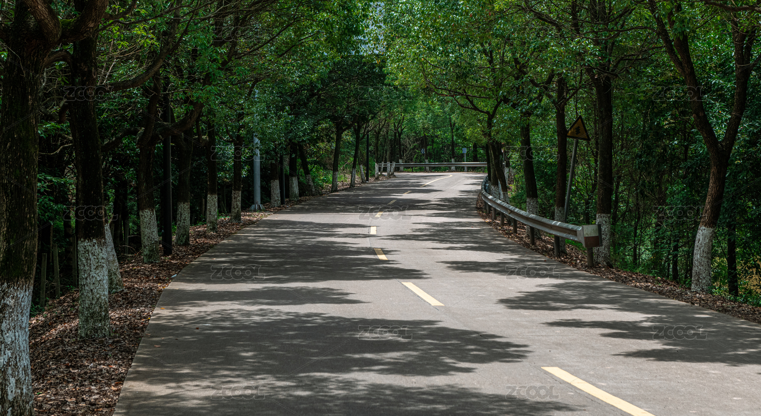 兩邊是綠樹的延伸到遠(yuǎn)方的彎曲的水泥路