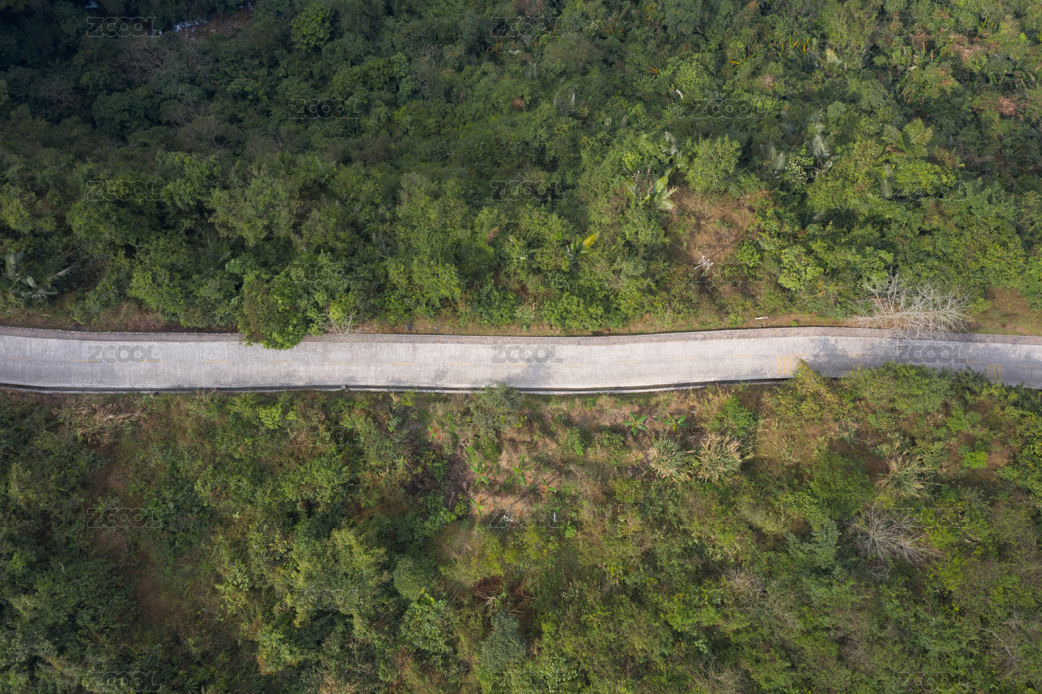 航拍俯視穿過野外樹林的一條水泥路