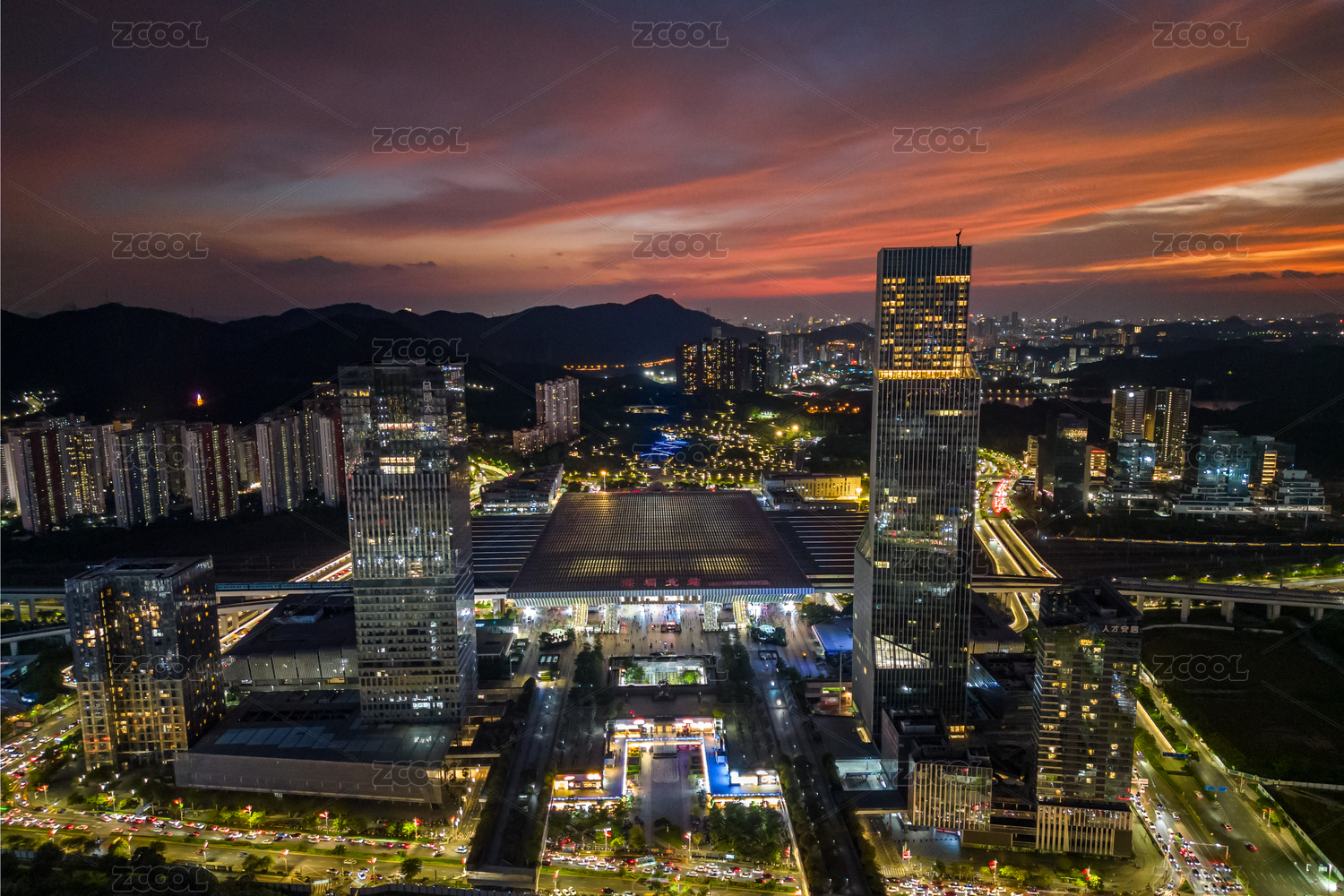 深圳市龍華區(qū)深圳北站晚霞和夜景