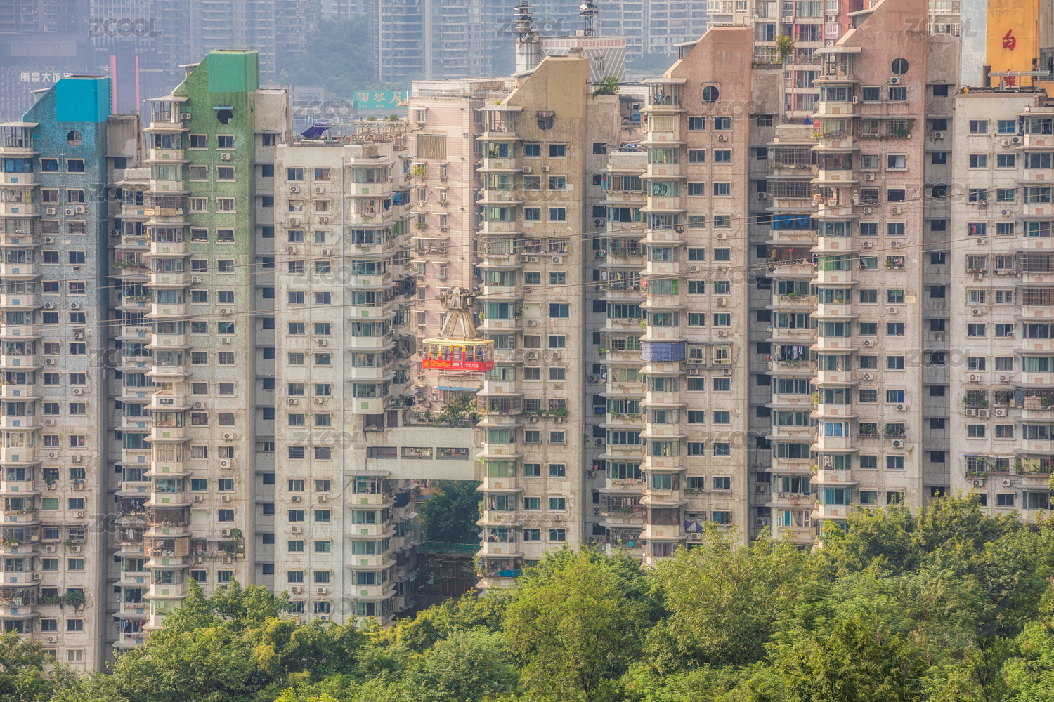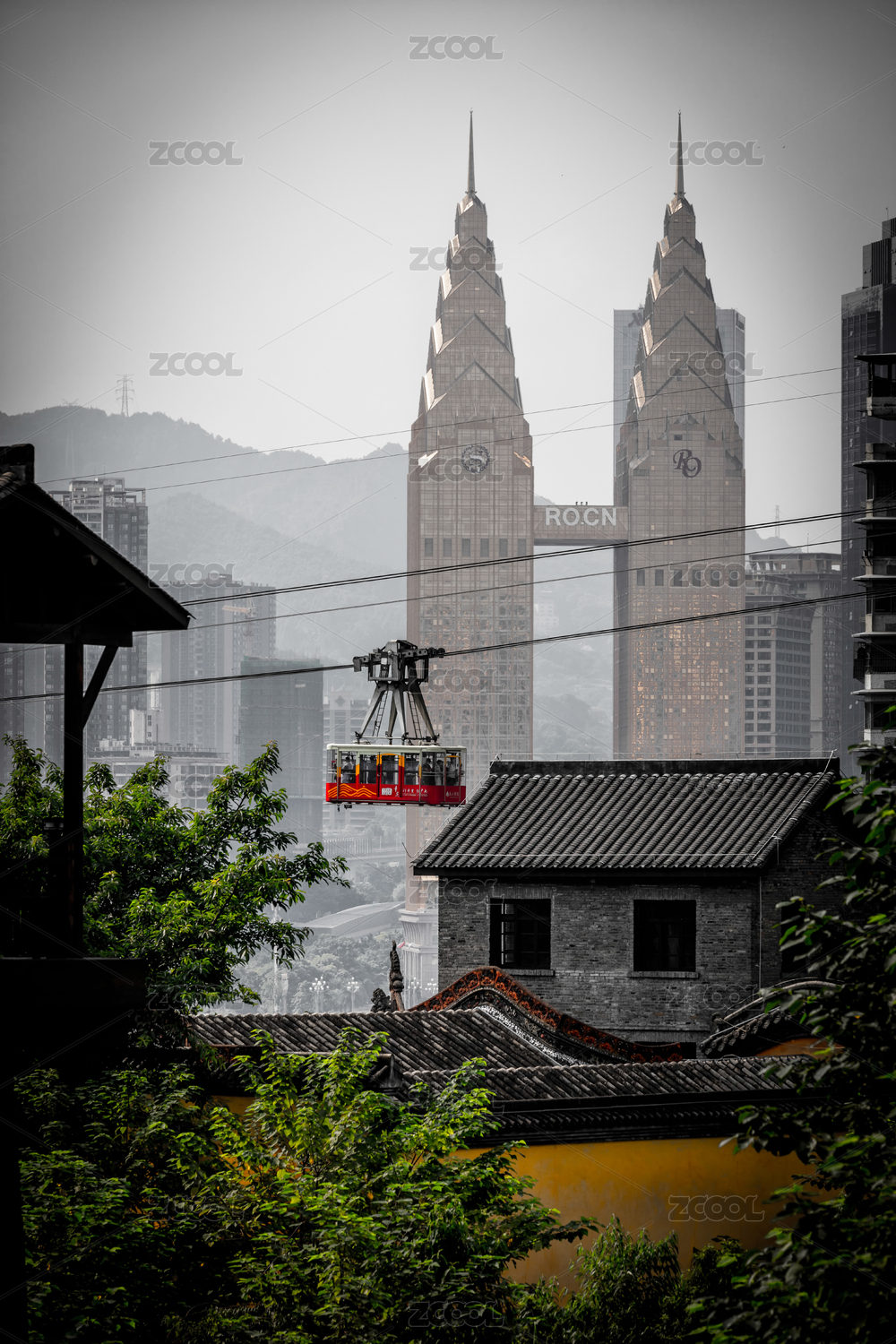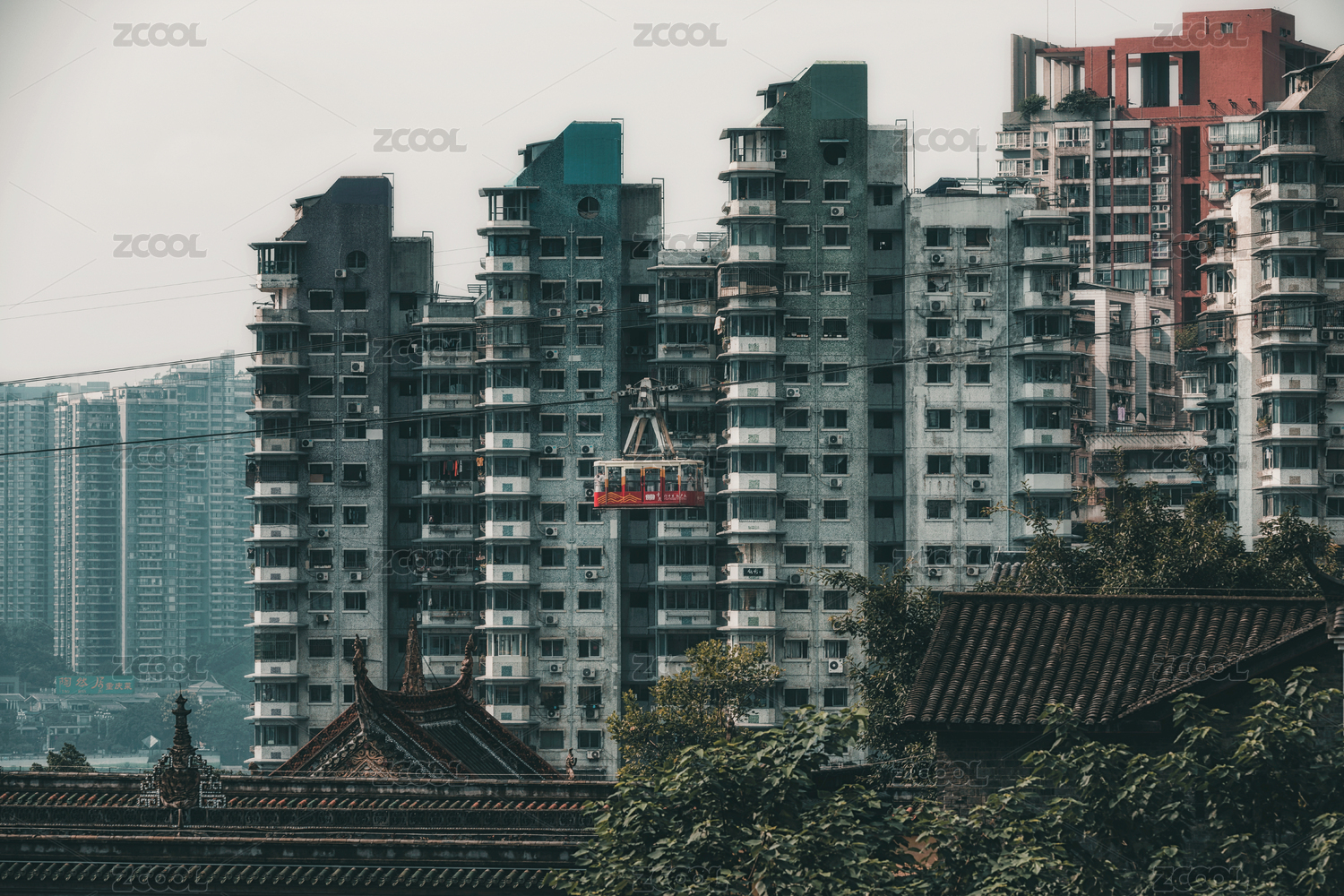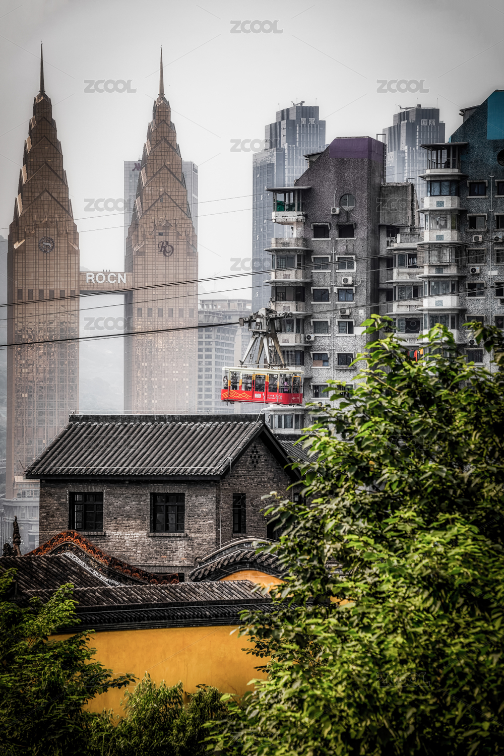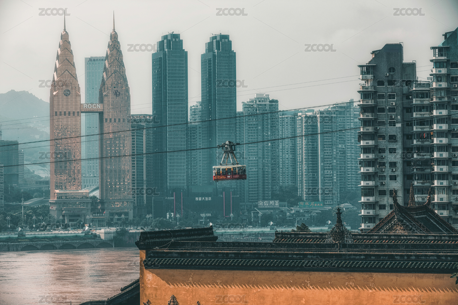 中國重慶城市高樓和長(zhǎng)江索道風(fēng)光