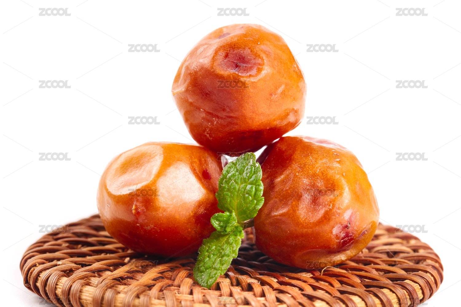 白底滕編墊上放著三顆香甜黃椰棗